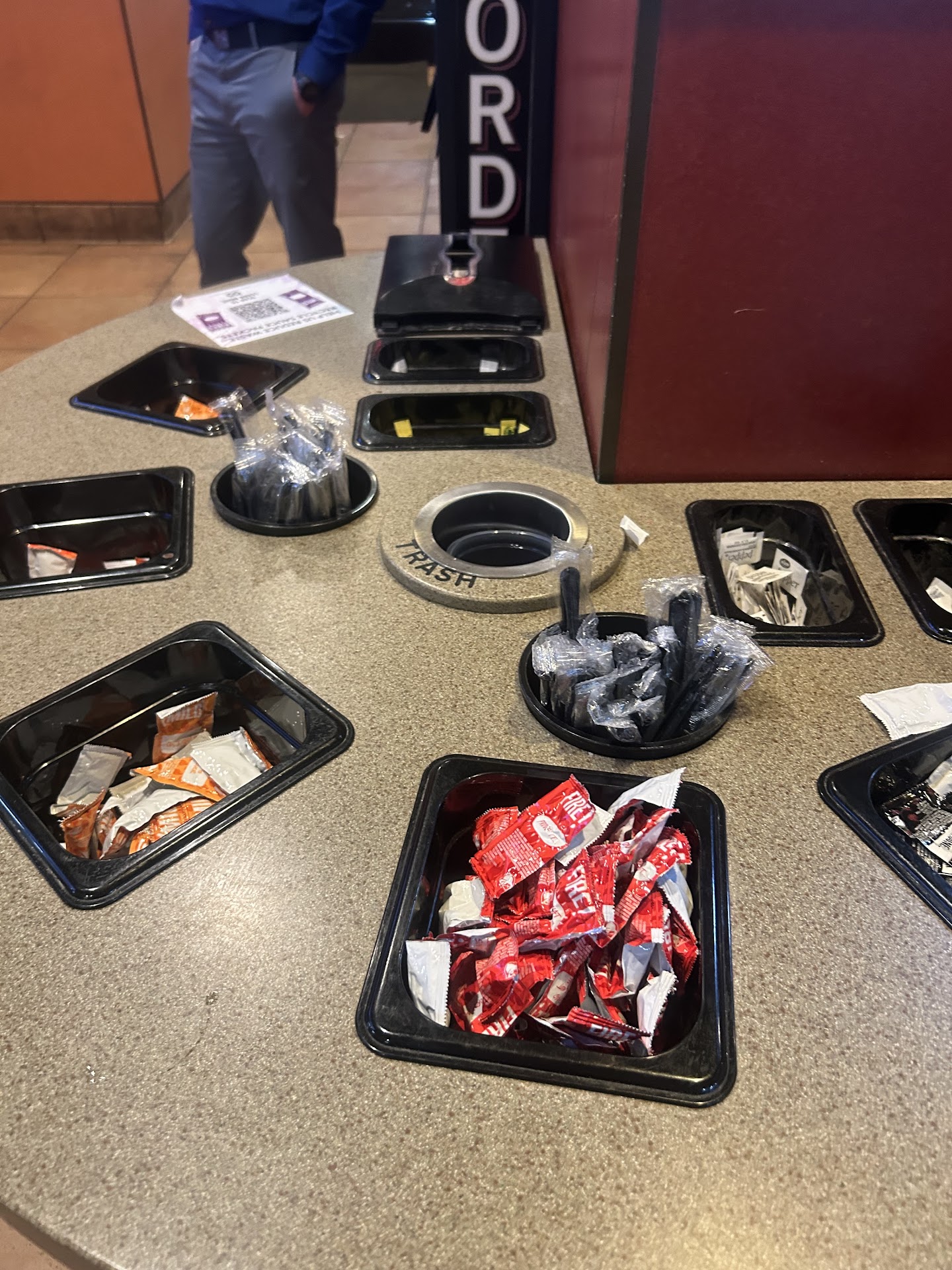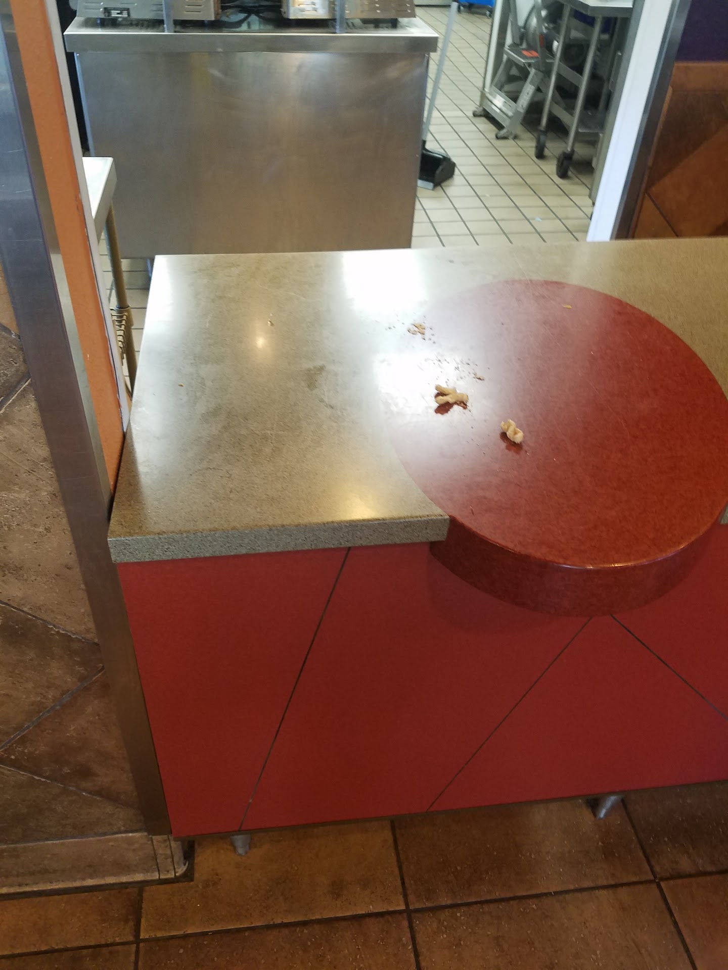Eventually a small woman comes out of one of the meal-prep stations and places a tray with an order down on the dirty (see picture) counter.