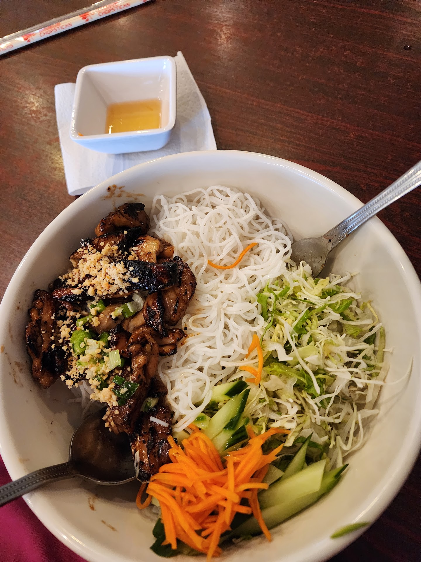 We came for brisket pho and were not dissapointed! The broth was very flavorful and had such a delicious depth of richness. The owner was very friendly and came out to make sure everything was to our liking. We shared that pho was my daughters birthday dinner request. Later he came out with an order of chicken wings stating that he didn't have cake but made her birthday wings. My daughter LOVES bone-in wings, more than cake actually so that was so kind. We also ordered and appetizer of the Bbq Pork Rolls (summer roll), which we thought was a unique creation and they were excellent! My husband ordered the Combination Stir-Fried Egg Noodle dish which had a good helping of protein and he really enjoyed it. We were impressed with the freshness and portion size of the servings. Oh! The chilli crisp on the table is house-made and totally hits on all levels. Our waiter was attentive and gave us great service. Give Thien- An Pho a shot to earn your business. We're sure...