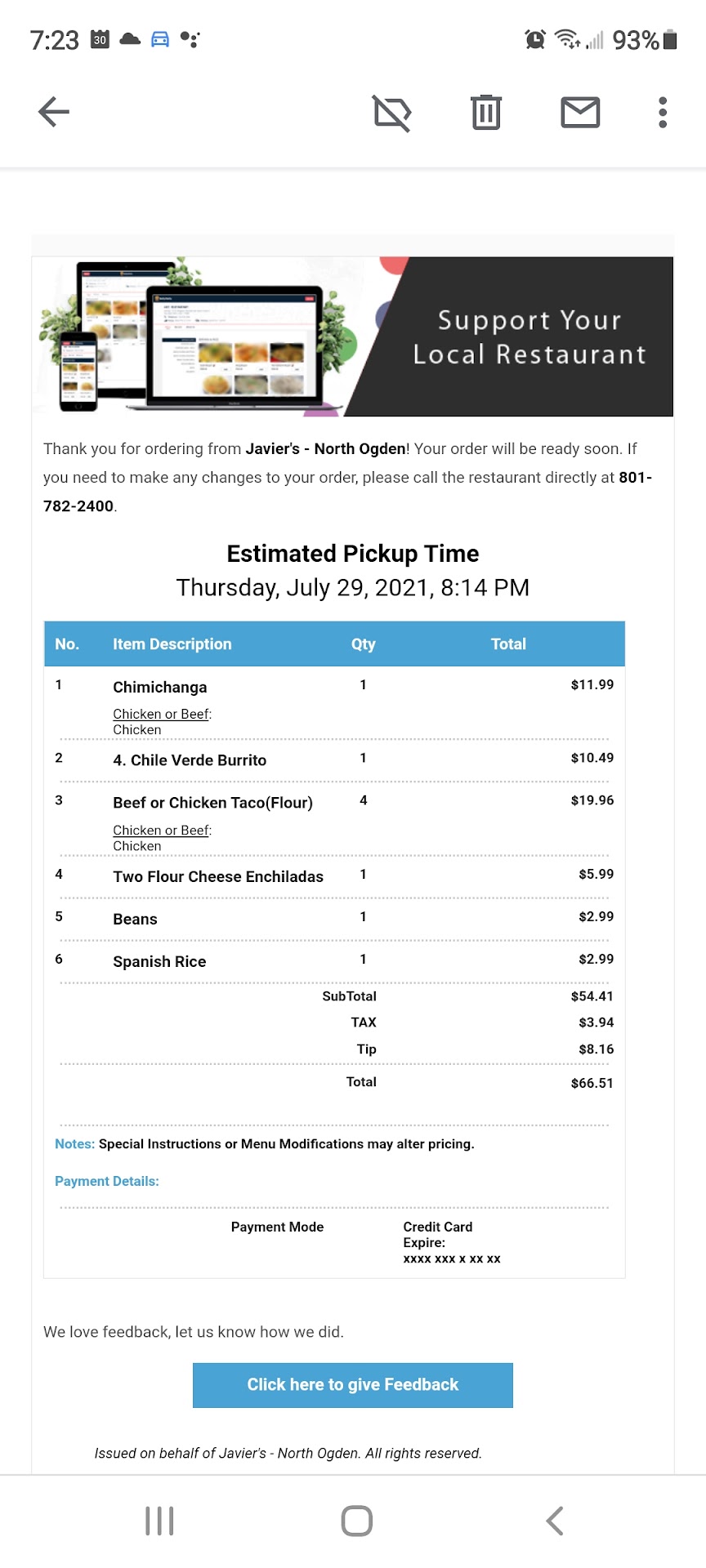 Read moreI love Javier's! They have the best food around. However, after my latest visit I don't think I'll be going back. I tried there online order to pick up. I ordered food that equaled out to an amount of $66 and some change. When I got to Javier's they only had half my order. When I explained this to the employee they told me they don't do certain things online. I was fine with that, so I ordered the missing food. They made me pay for that extra order and still charged me the full price for my online order. So now I've been billed and paid for two items twice when I only got the items once. I tried to explain this and the worker to me they only charged me for half the $66 and change. But as you can see from my bank statement they charged me the while amount along with an amount of $24 and change. Extremely unhappy with my service and for this probably will never go back to...