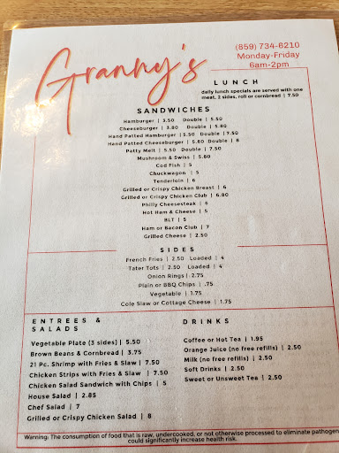 Read moreIn Harrodsburg for a golf trip and resort restaurant wasn't available. Found Granny's online so scheduled our first breakfast there. Young lady greeted us with a smile and was very friendly. Ordered eggs, bacon and hashbrowns. She performed serving and cooking duties. Everyone in our group had plenty to eat and it was delicious. We visited this little diner each morning. Would/will visit her again if in town. Highly recommend for service...