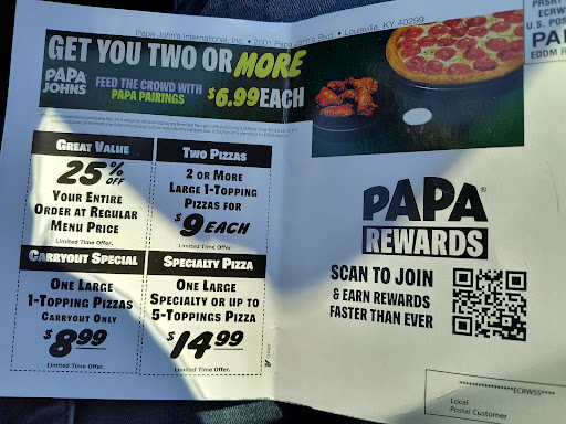 Read moreDecided to give Papa Johnâs a try because theyâre slightly closer. Shouldâve just walked to Dominoâs barefoot in the rain instead. Took over an hour to get three pizzas, which arrived with all the warmth of a cold shoulder. Toppings were huddled in the center like they were scared to use the whole crust, and the gluten-free crust? Pretty sure I could have used it to re shingle my roof. Delivery driver somehow took 35 minutes to travel less than a mile did he walk backwards? Dominoâs might not be gourmet, but at least their pizzas arrive hot, toppings in the right zip code, and before Iâve aged a year. Papa...
