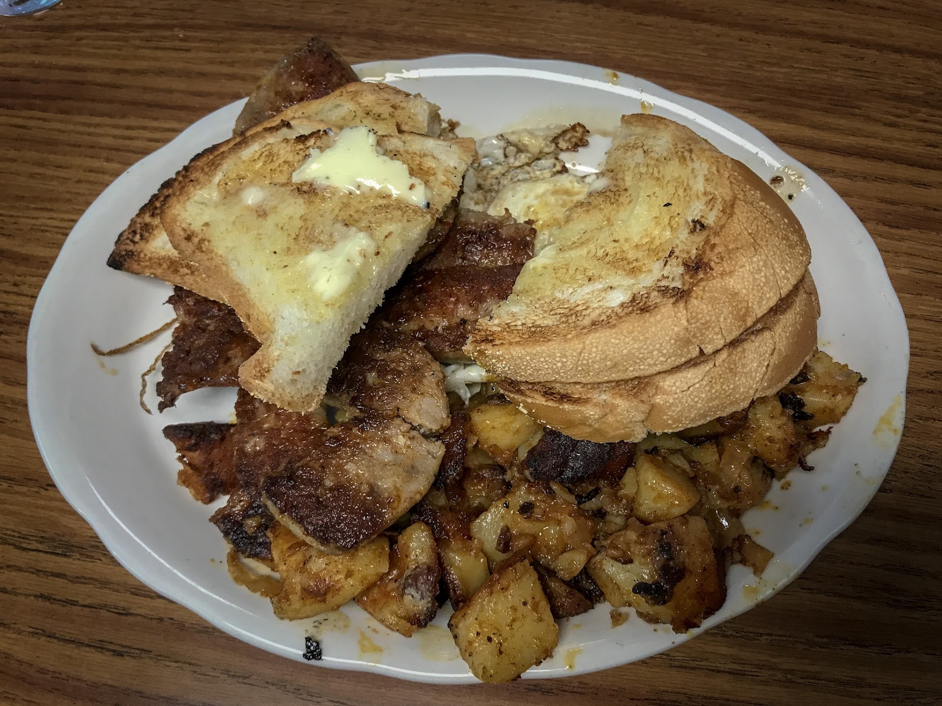 I just enjoyed a nice fluffy huge pancake and bacon. Both were good. Not a fan of whatever their syrup is but that's an individual preference. My friend got an omelette with potatoes and bread, which was all huge (wish I got a better picture of his plate). He too enjoyed his meal. I would definitely recommend. I removed 1 star only because I wasn't a fan of the syrup and the prices are a bit high. Normally for what I paid I could get bacon, eggs and a pancake. But again, it's worth going to in my opinion if you're looking to invest in a local restaurant and not to chain or...