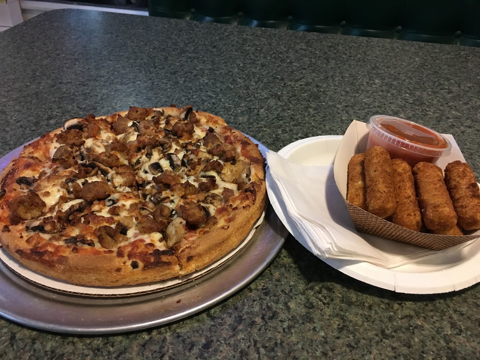 On my first visit, for dinner, I was super hungry and went with a small pizza with sausage and mushrooms and a side of cheese sticks. The pizza was very fresh and piping hot, so I started on the cheese sticks first. They were good and served with marinara sauce. The pizza was simply amazing: the crust and sauce was so good and the toppings were really delicious.