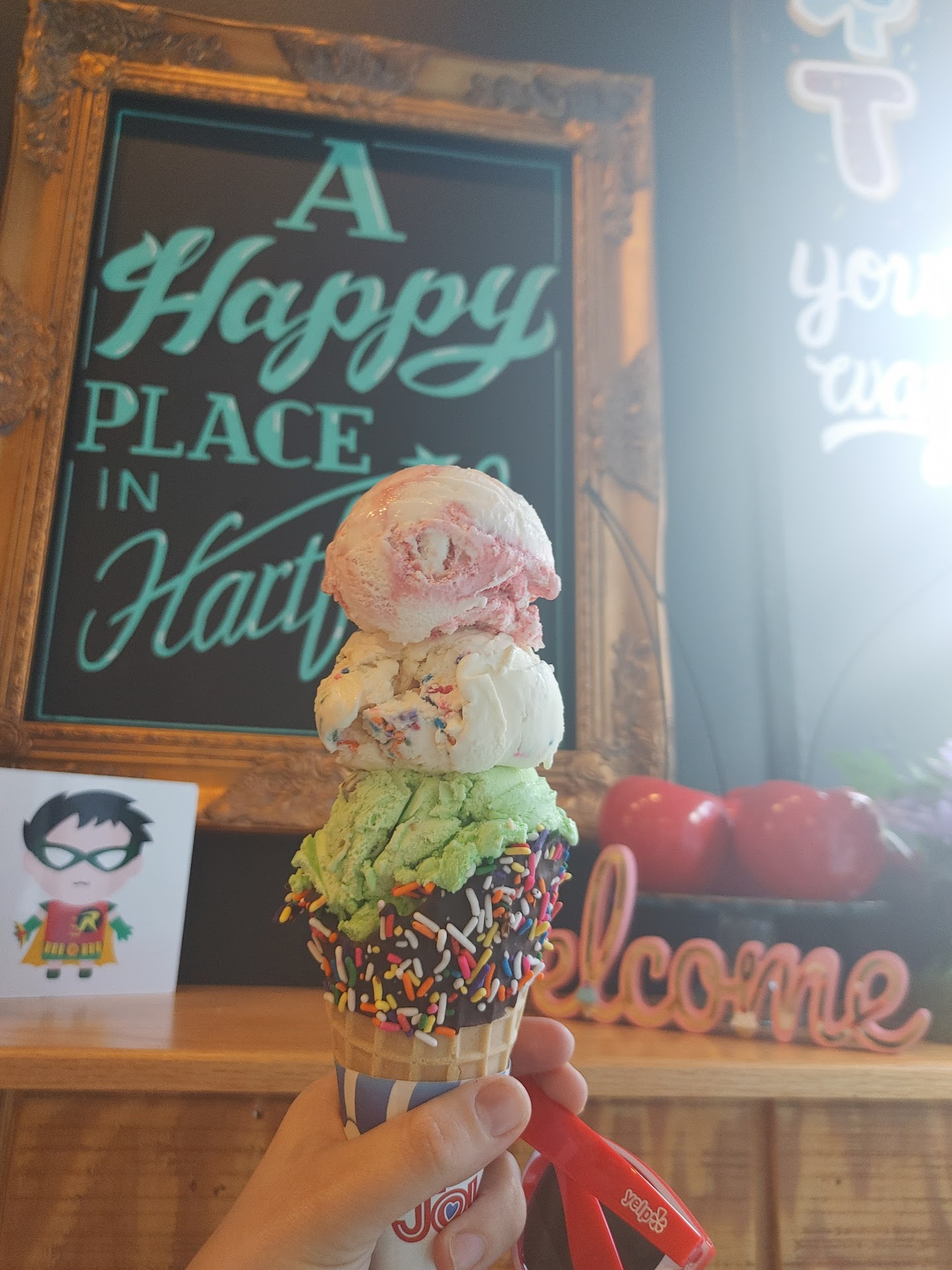 Read moreWhat a cute ice cream shop located in Hartford CT. Various unique flavors along with the classics... I followed them on instagram, I'm a sucker for local owned businesses. And this one happens to be woman owned!!!! The shop is nicely decorated with bright colors and ice cream themed. The staff is so friendly. Street parking is available. But in walking distance from parking garage and food options. And if you like to walk your calories off you can always walk to Bushnell Park after. I was there for yelp elite event called scoops and shades. I ordered a 3 scoop on a cone. I ordered. Strawberry lemonade, birthday cake and green cookie dough... the one that I was wondering what it would taste like and if I would like it turned out to be my favorite which was strawberry lemonade. And green cookie dough most likely taste better than just regular cookie dough. Lol birthday cake tasted just like cake.. Whenever I'm in hartford. And want desert I'll definitely be...