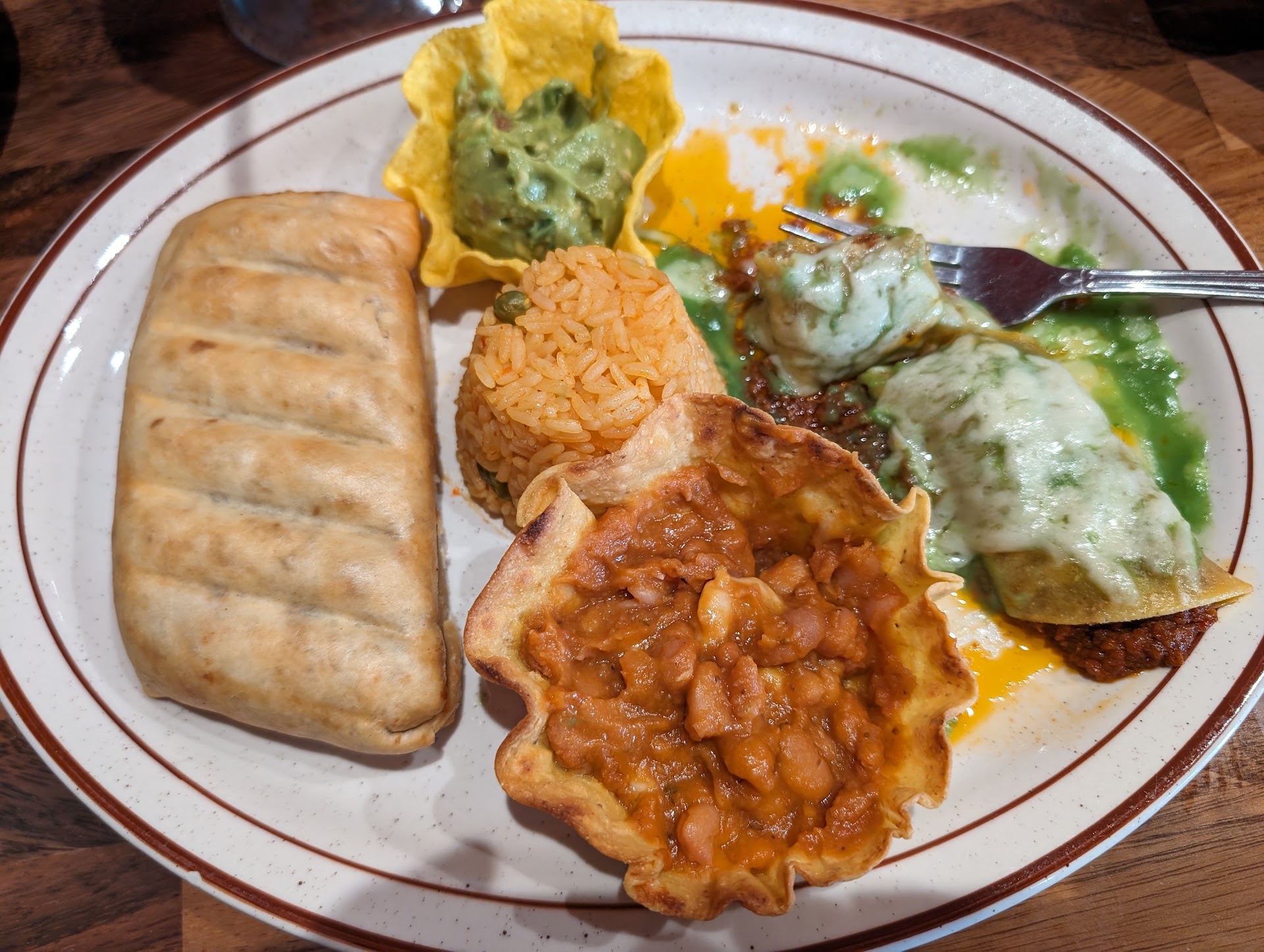 I had the pork chimichanga and enchiladas with refried beans and rice, my friend had the enchilada trio and a shrimp taco.