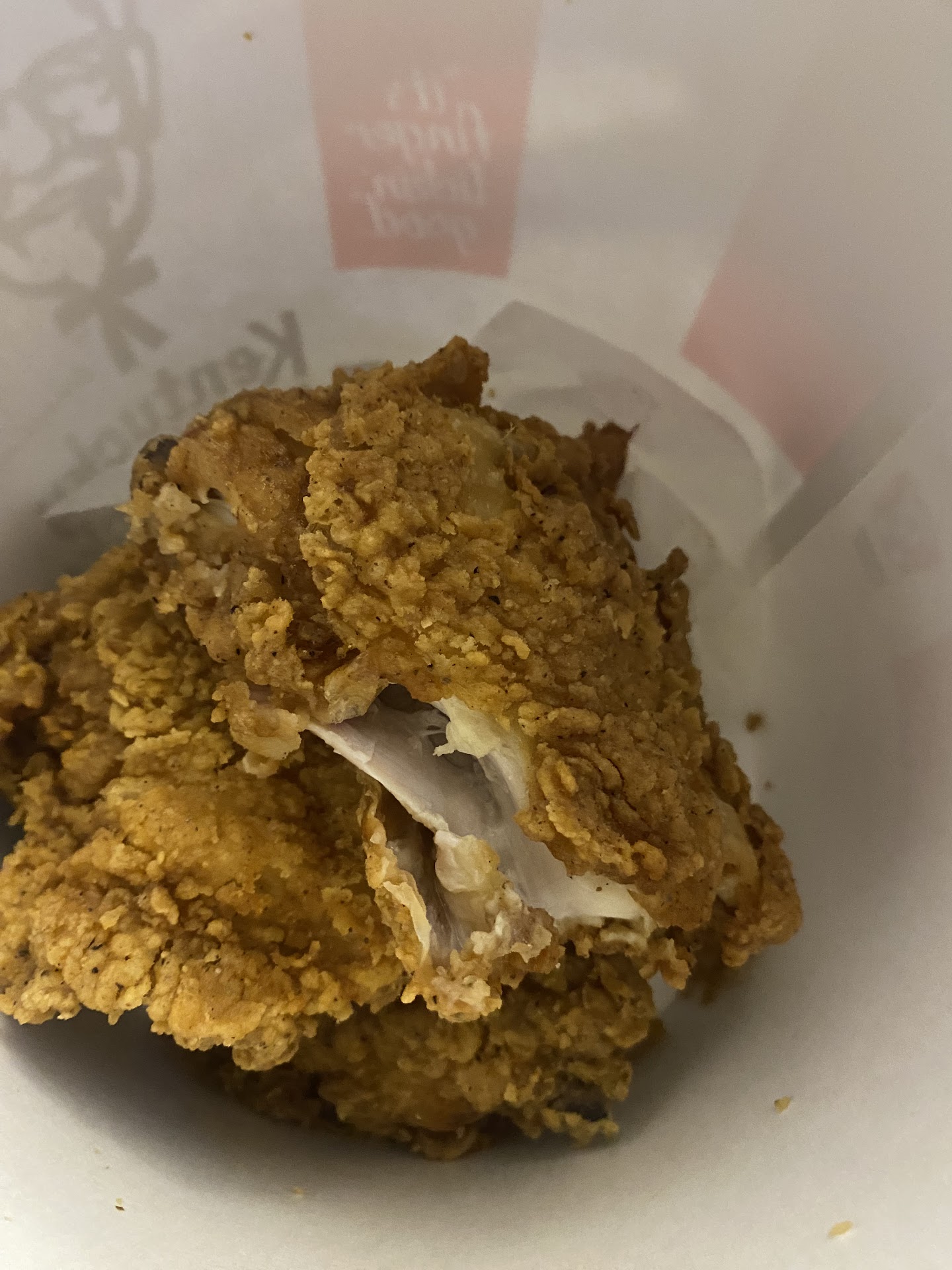 😞 hard to be disappointed in a KFC considering they should all be the same and at the end of a horrible day I realized I was very close to that comfort food goodness I hadn't had in several years. It was old chicken cooked and then warmed up. It was all around just cold and then warmed up food. The coleslaw was good...the store was dirty but since I wasn't eating there I didn't care. Just all around poor service and food. But then again, I was the only white person in there and several people were busy talking over the counter and climbing over to get their own order and eating food off the line. People who openly laughed when I asked how long it would take. I ended up throwing most of the food away and...