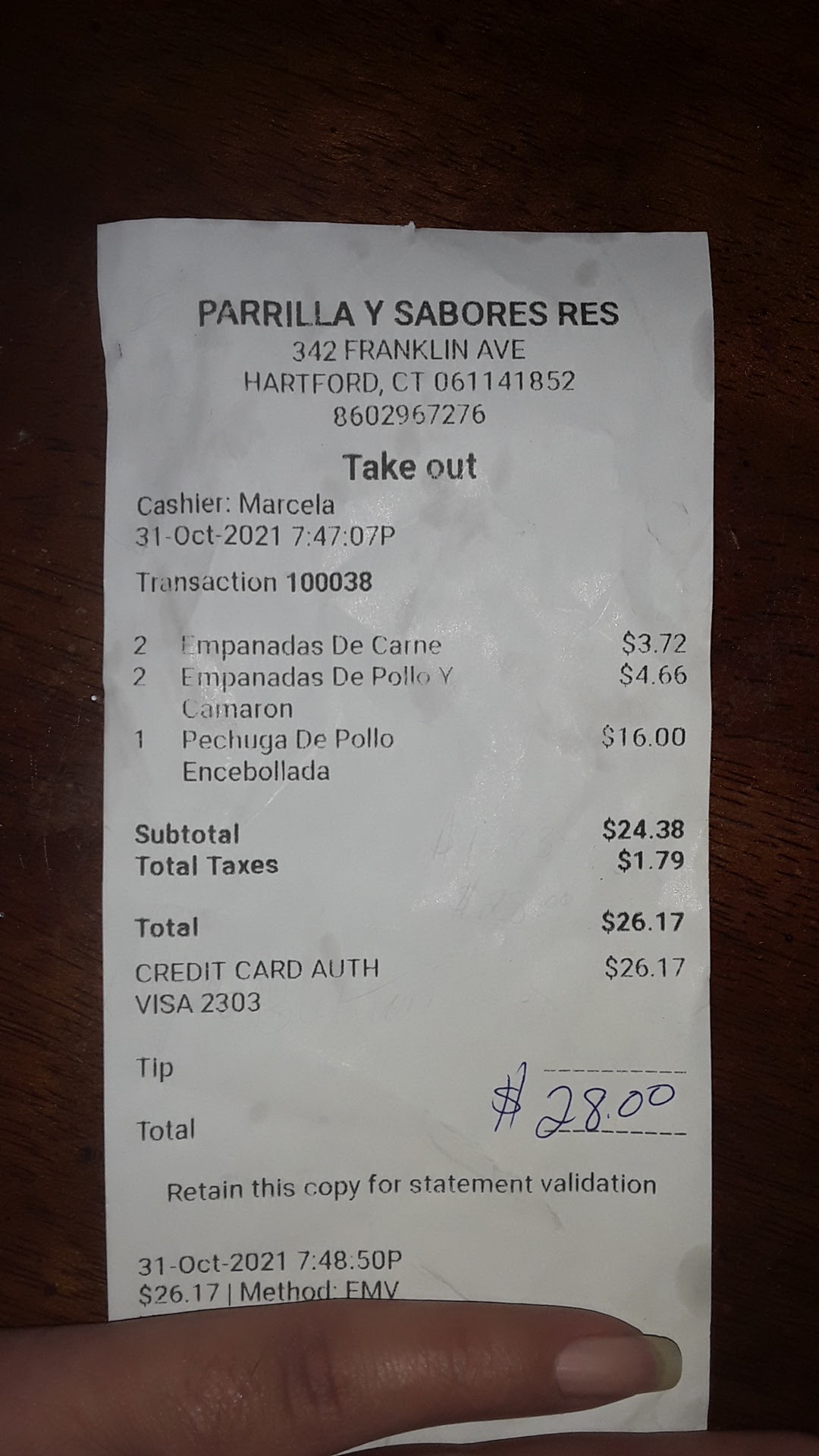 Read moreIt was my first time coming to this restaurant and ordering take out. The restaurant was extremely clean. Didn't know they had a bar and they had an artist singing. I felt a bit out of place, I had just gotten out of work and my attire wasn't the best. The staff there could tell it was my first time there, they were trying to suggest different items from the menu for me to try. The items on the menu are a but pricey, but the portions and the taste make up for it. I ordered 4 empanadas, 2 chicken with shrimp and 2 carne. The salsa that comes with it is amazing, definitely a must add. One of them didn't make it on to the photo cause I was starving and ate it on my drive home. I highly recommend the empanadas they are delicious and crunchy, very different from the empanadas I'm used to made with flour discs, these are made with cornmeal. They are great! I also ordered the chicken breast with sauteed onions, white rice and beans. Although I waited for about a half hour for my food, the food was great, everything was fresh and tasted delicious. No way you can finish their plates in one sitting, I got full fast and still had leftovers for the next day. Would definitely...