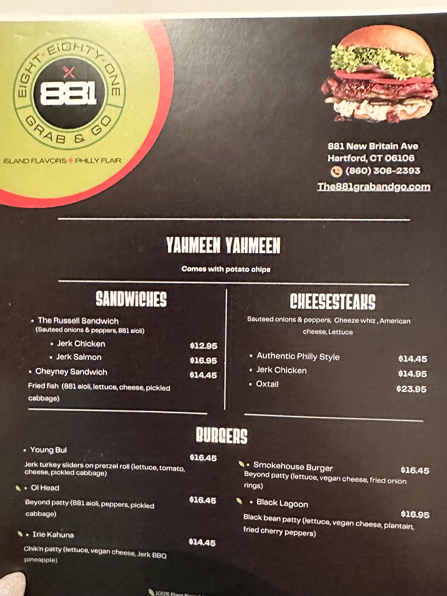 Ā Ā Ā Read moreI recently visited 881 Grab and Go, known for its unique Caribbean flair and Philly style, located at 881 New Britain Ave., Hartford, CT. As a culinary professional deeply passionate about food and community, I was immediately struck by the restaurantās clean, vibrant ambiance, enhanced by stunning original artwork and a useful community board for local businesses.