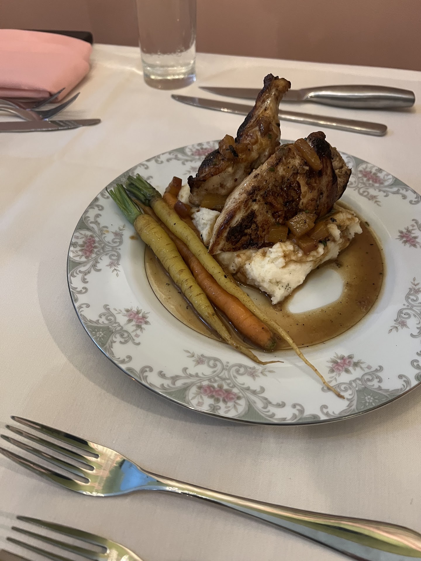 My drink, app, entree and dessert were all so good! Usually I don’t order chicken dishes at restaurants because I am worried it will be dry. THIS CHICKEN DINNER WAS SUPERB. The peach gravy was delicious and the chicken was well seasoned and very juicy. It was placed on top of mashed potatoes and veggies.