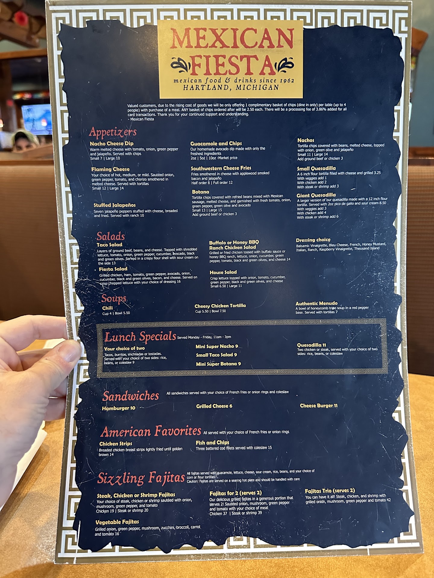 Read moreWe had to go here as a backup because the cook your own steak place had a major wait time. We have heard good things about the Fiesta before. We were pretty surprised to see it completely staffed by what appeared to be older high school/young college students. Salsa was typical fare no real complaints, but it should be thicker as it runs off the chips quickly, but it was nice to be given a spicy and mild together. They have a poor draft selection but not unusual for a Mexican restaurant.