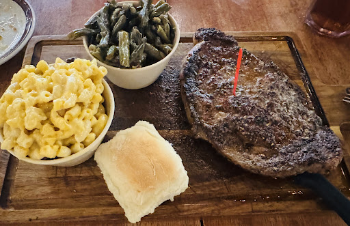 Read moreFirst time, and my impression on just my meal & cost for what you get. 3 stars based on an almost $40 dinner - bone-in 18 oz rib eye steak, that was more fat than meat, and not your typical marble. The seasoning was good though, and cooked how I asked. Side was small baked potato that had tiny bits of bacon (the kind that comes in a bag at a store), dab of butter & sour cream. Also a salad that consist of shredded iceberg lettuce, a few diced tomatoes, shredded cheese, and store bought mini croutons. I expected to pay the cost for a steak dinner, but much improvements is needed on the cut & sides for the cost. Also ordered an additional side salad since meal was to be shared. For $5, add some cucumbers, and leafy spring greens - get rid of that shredded iceber. One more thing I want to add. The chicken salad sandwich was good (according to my daughter), but if it's nearly $3 to have sweet potato fries, instead of potato chips - give more than just a handful. Most likely be back again to give it another try, but now we know what we get for the cost (quantity & quality) and what to...
