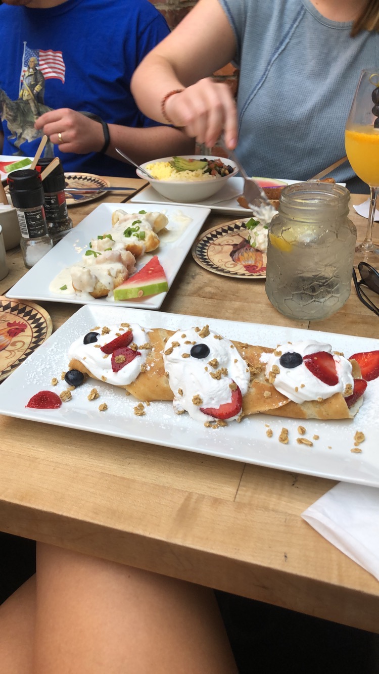 The menu is pretty limited, but what they are serving up is delicious. The biscuits and gravy are small bite sized delights that are shareable. The gravy was smothered over small and light biscuits with green onion on top. For the main course I ordered a yogurt and fruit stuffed crepe. It came in what looked like a crepe roll up, which has been my favorite presentation of this dish I’ve seen. On the menu it read (from my memory): yogurt, fruits (berries), and granola. They delivered on the yogurt. It was a simple vanilla hidden in the crepe roll. The berries were fresh and flavorful, but would have appreciated more of the freshness with every bite. The disappointment was the granola. A few crunchy bits were scattered on top, but my expectation was having that texture throughout the dish. The crepe is worth tasting, but I’d split it and order...