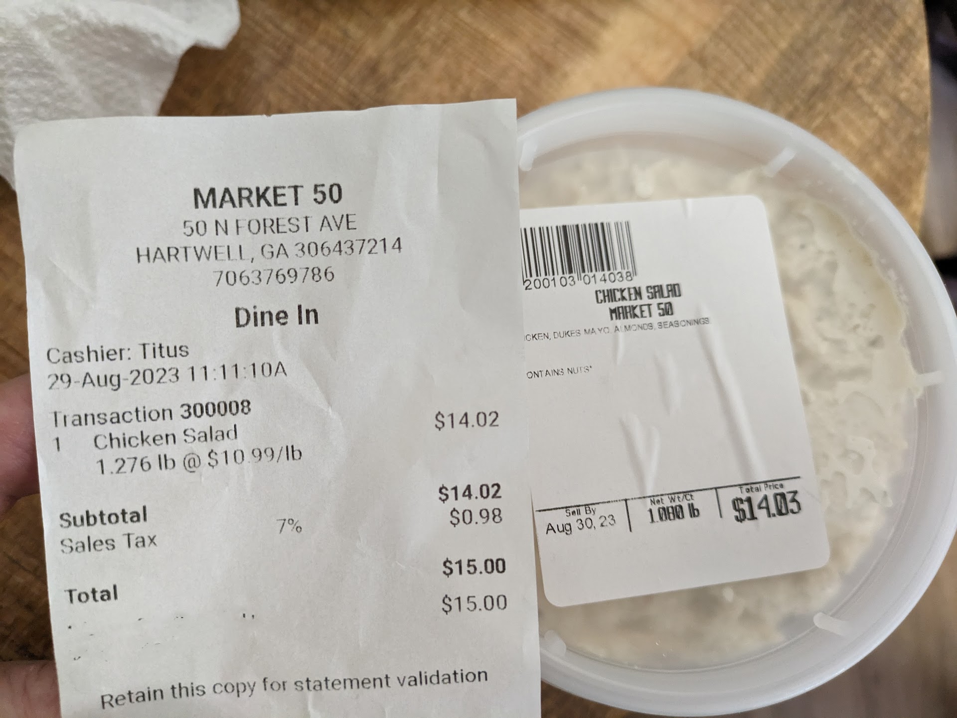 Read moreLove the Chicken Salad, get it almost every week. It is expensive but I don't mind paying for quality. But I DON"T WANT TO OVERPAY! I just bought this chicken salad (see picture). The math doesn't add up. On the label it says: 1.080 for weight that doesn't come up to $14.03 at $10.99 per pound. And the receipt has a different weight of 1.276 (which will come up to $14.03). BUT we weighed it at home and the whole amount container and all does not weigh but 1.010. So please check your scales and stop over charging. Until then I will not be back.
