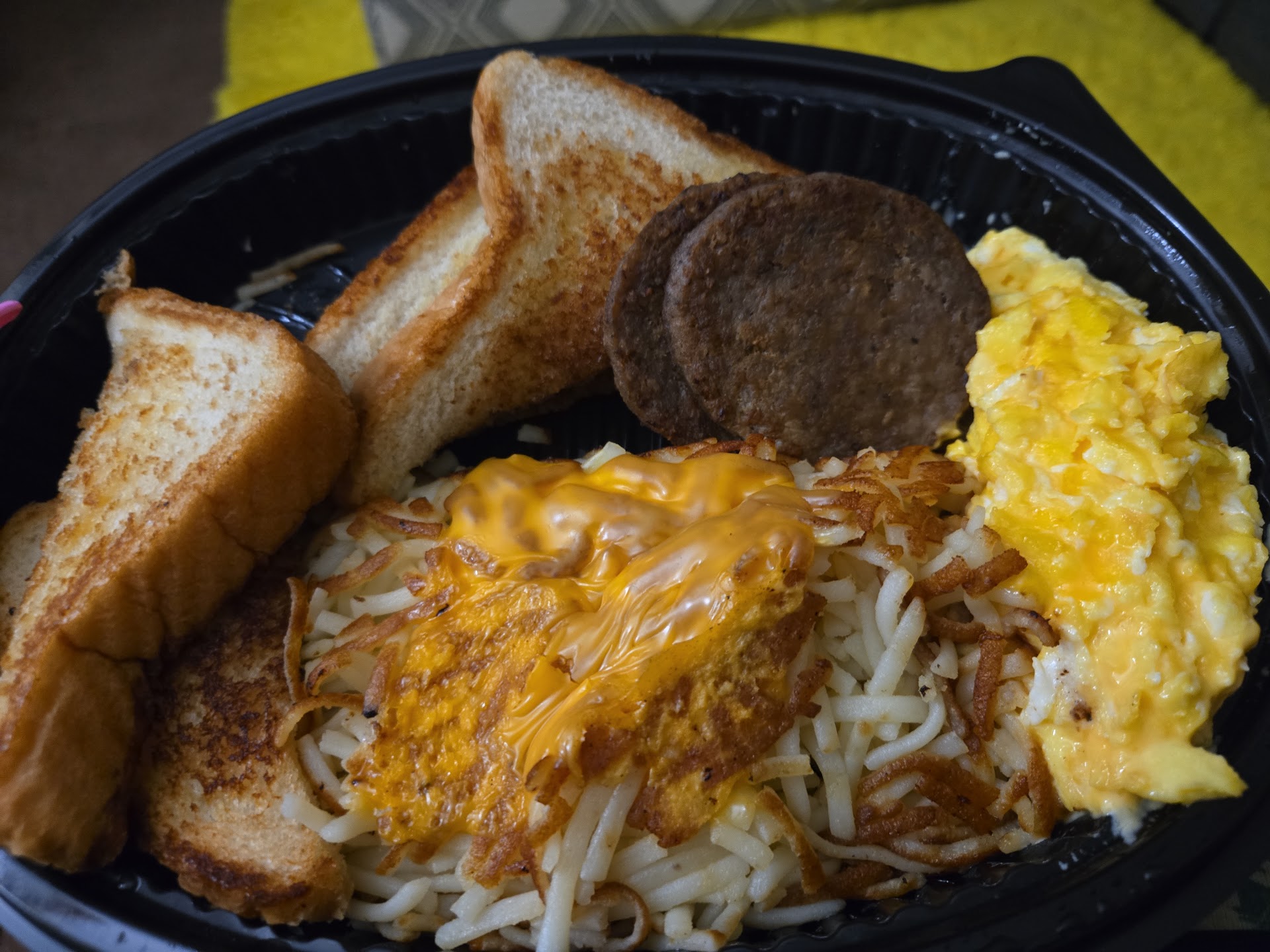 I always get a double order of scattered, smothered, peppered, and capped. It was just right (eg the peppers weren't clumped in one spot). I asked for a bit of regular milk for my coffee and they gave it to me without question (I'm just not a fan of the little cream things and am willing to pay for the extra milk).