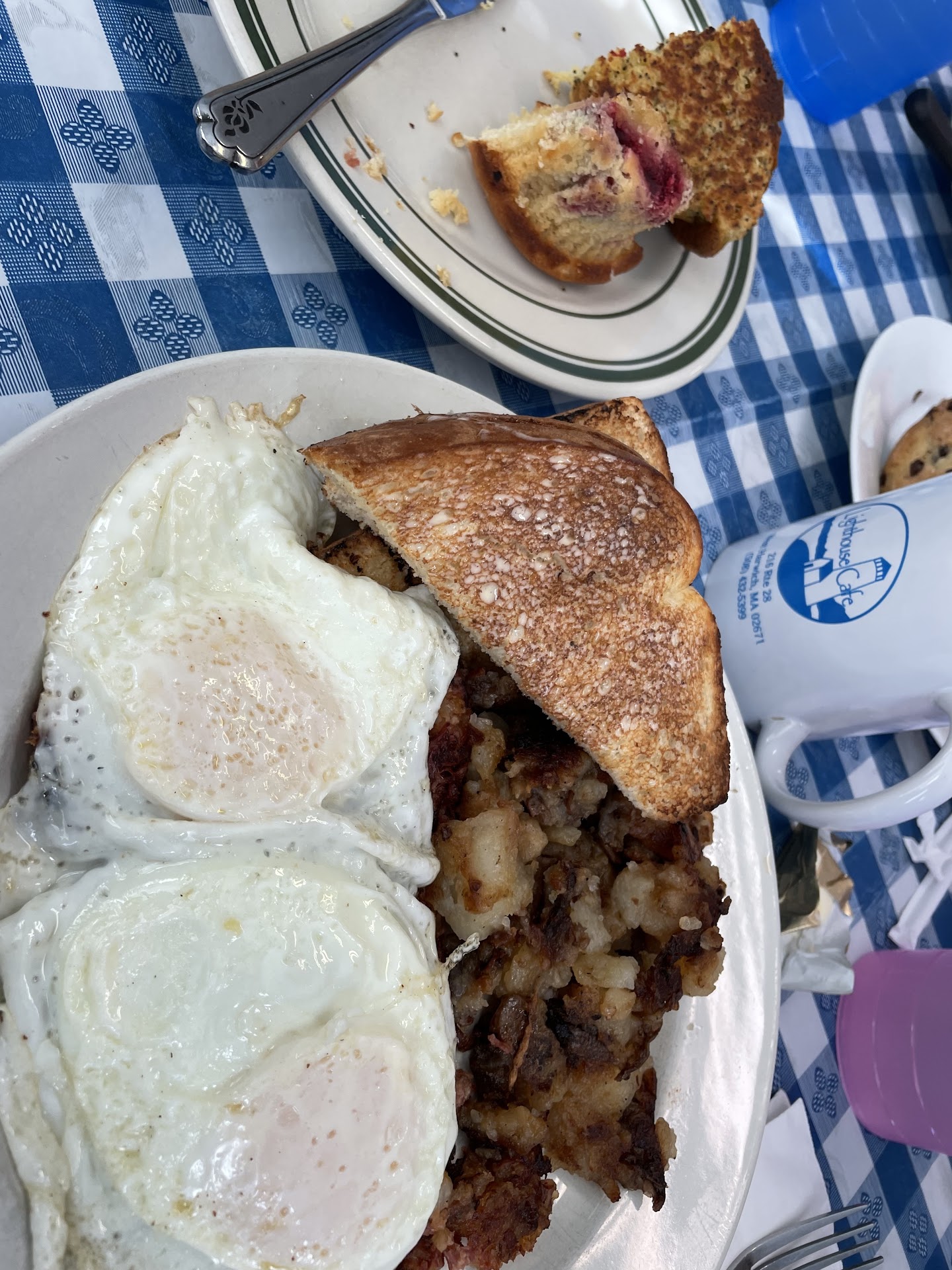 Step back in time to a neighborhood restaurant…no reservations…only serves breakfast…and only takes cash (no worries theres an ATM inside). Breakfast was everything you hoped it would be. Small tables tucked into cozy corners, waitstaff walking around refilling coffees, specials of the day written on the white board, and fresh homemade food. Prepare for a wait to get in; with no reservations and being a popular place, but the staff is like a fine oiled machine and knows how to move things along. The menu is massive with something for everyone…pancakes, French toast, breakfast sandwiches, eggs every way imaginable, muffins, etc… I went with a special of the day, the breakfast melt which was 2 eggs, bacon, ham, and Swiss on toasted sourdough with home fries. Great sandwhich, full of flavor, very tasty. The home fries were good but nothing to write home about. We also shared a toasted cranberry/blueberry muffin which was like having dessert. Sooo good. Definitely get a muffin and have it toasted. My husband got an omelette which was huge. It came with toast and home fries. ...