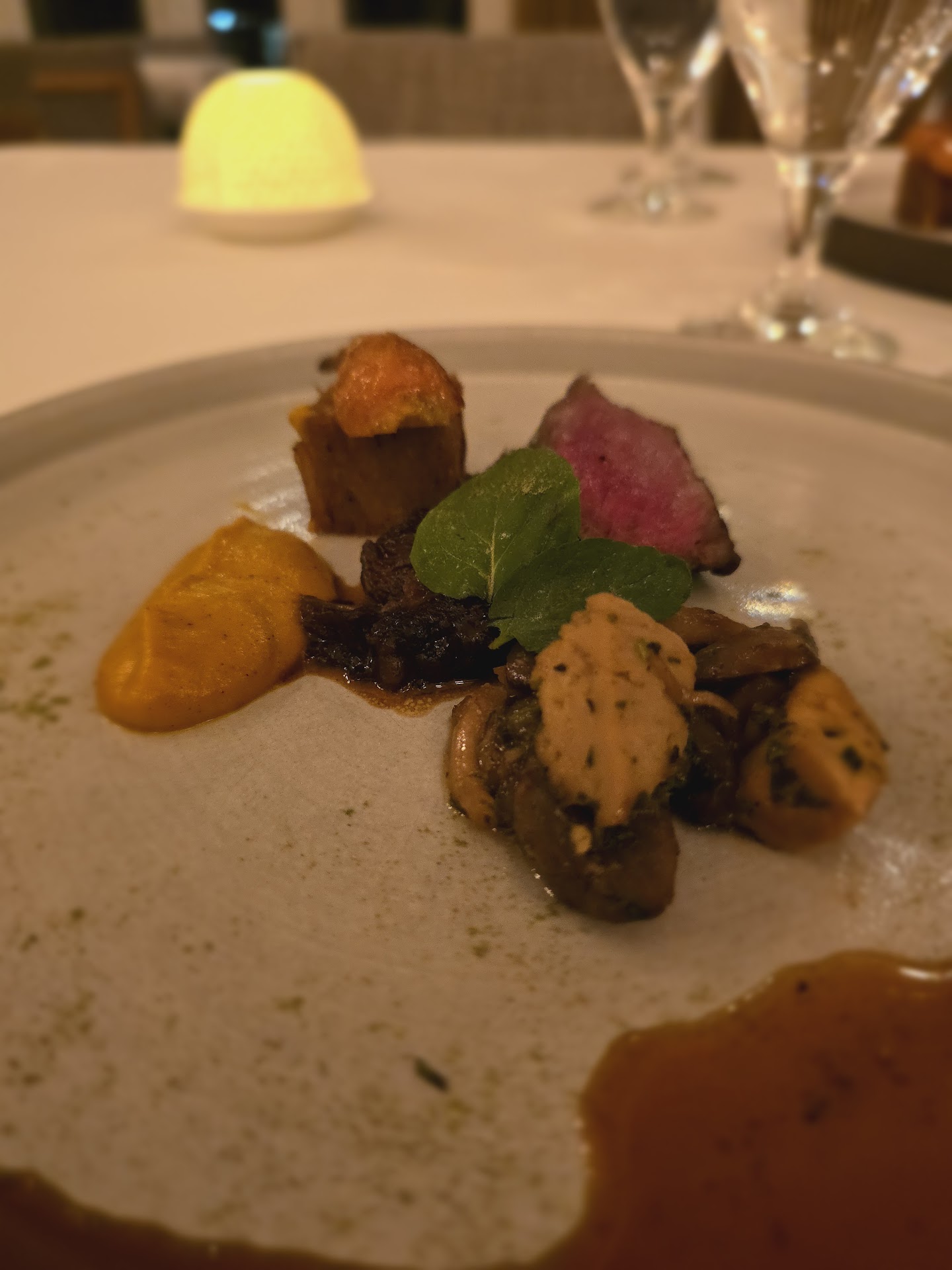 Australian wayu beef, potatto pavee, punking spice puree with roasted heirloom carrot, braised beef cheecks, and demi glaze (I'm missing something).