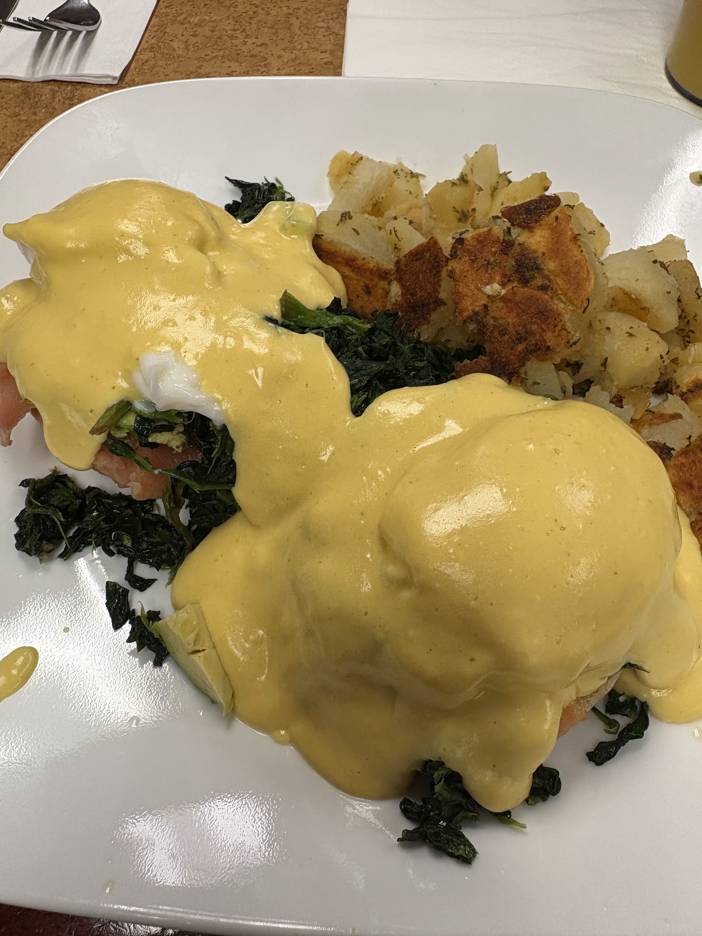 I ordered the Tower Breakfast (the first item in the menu under the Benedicts section), which came with fried potatoes as a side. When I tried the potatoes, they were extremely sour — clearly spoiled. My daughter’s side potatoes tasted exactly the same.