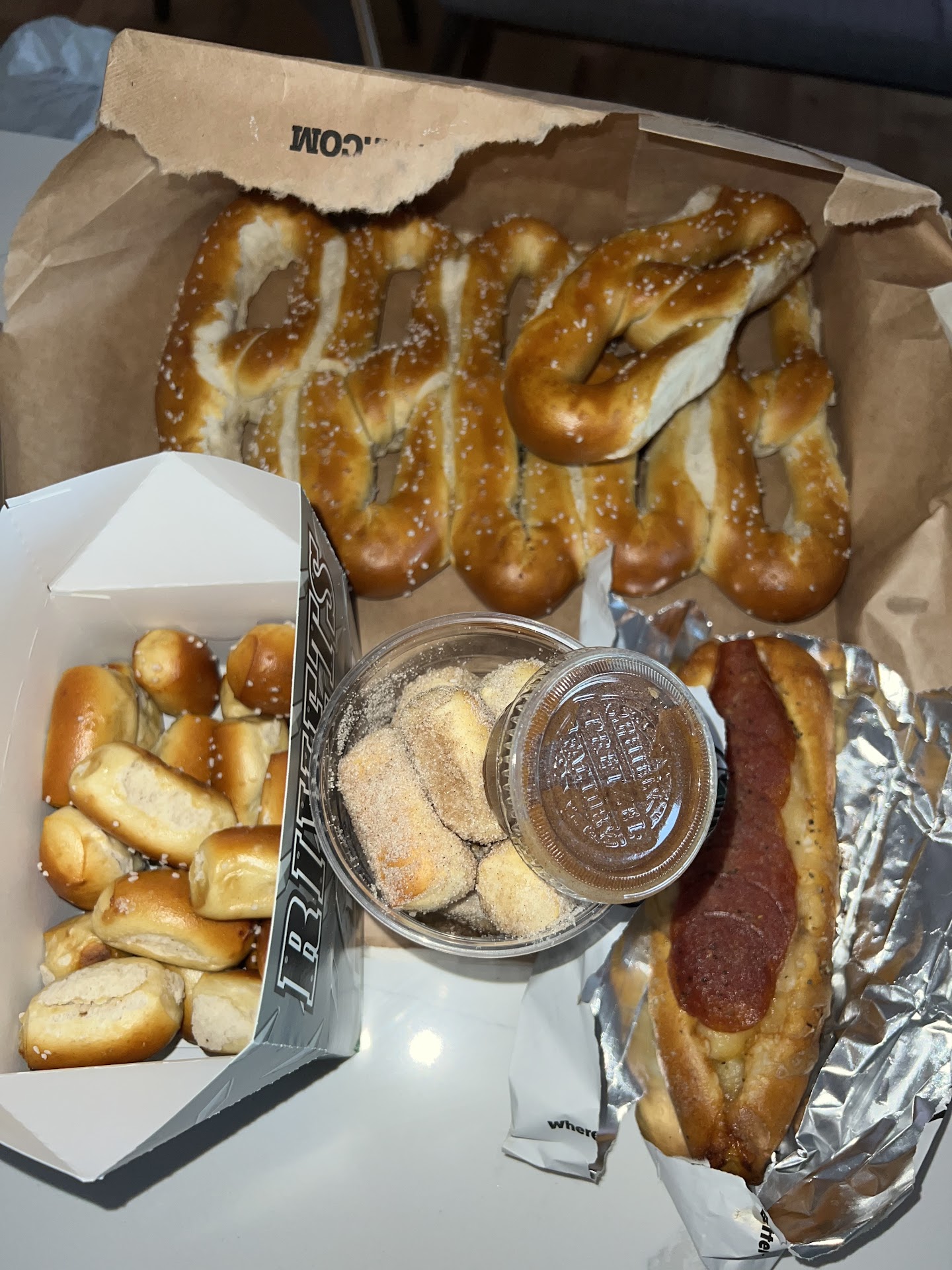 I ordered for a pick up for a Tuesday at 5 pm via Too Good to Go. The app allows you to order a surprise bag of a restaurants remaining food for the day, for a discounted price. I’m the bag was a row of pretzels, pretzel nuggets, cinnamon sugar pretzel nuggets, and a pepperoni stick. While the amount of food we received was appreciated, we ended up having to throw most of it out. Most of the items tasted like they were from the day before and not the day of. The row of pretzels was so chewy. The only thing that was decent was the pepperoni stick.
