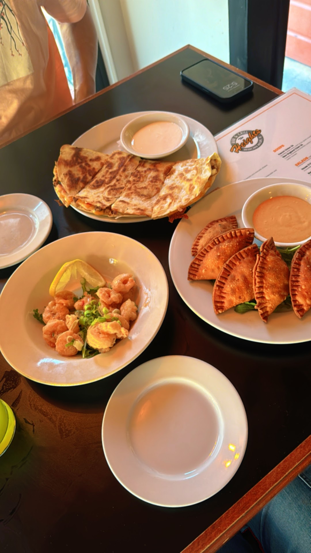 About 4 of us got burgers. Mine was supposed to be medium rare and my co-worker's rare, but we both got well done. Burgers were not bad overall. Empanada appetizers are fried/crispy. Spinach dip was what we expected. My coworkers liked the bang bang shrimp but I didn't get to taste it.