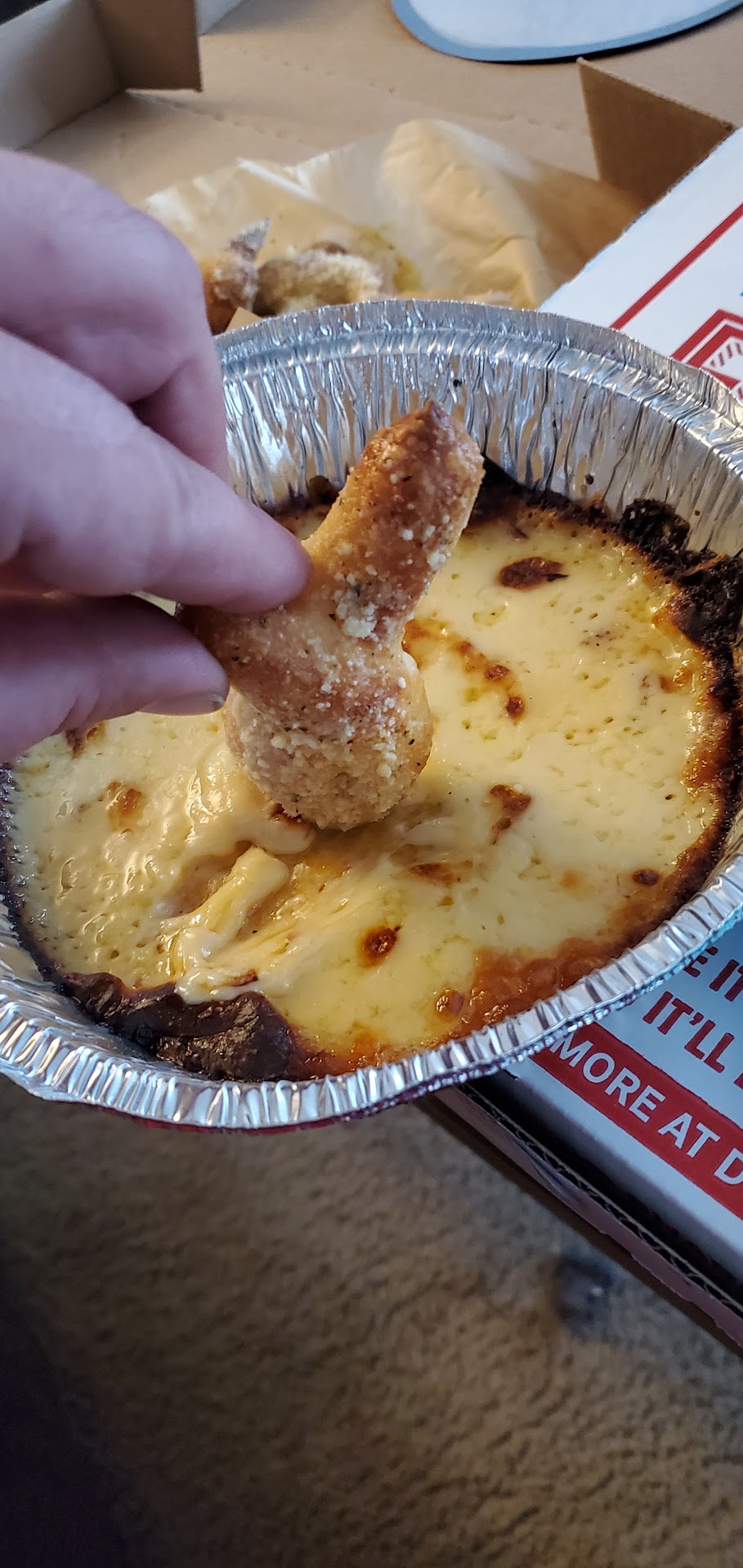 DONT ORDER THIS! ITS A 1/16TH OF AN INCH CHEESE CRUSTY... THEY HAVE IT IN A 6" ROUND TIN TRAY AND YOU CANT DIP ANYTHING! ITS HORRENDOUS!!!!!! I WILL POST PICS. PUT IT IN A SMALLER, SAY 3" TRAY SO YOU CAN ACTUALLY DIP AND IT DOESN'T BURN TO THE BOTTOM OF THE TIN!