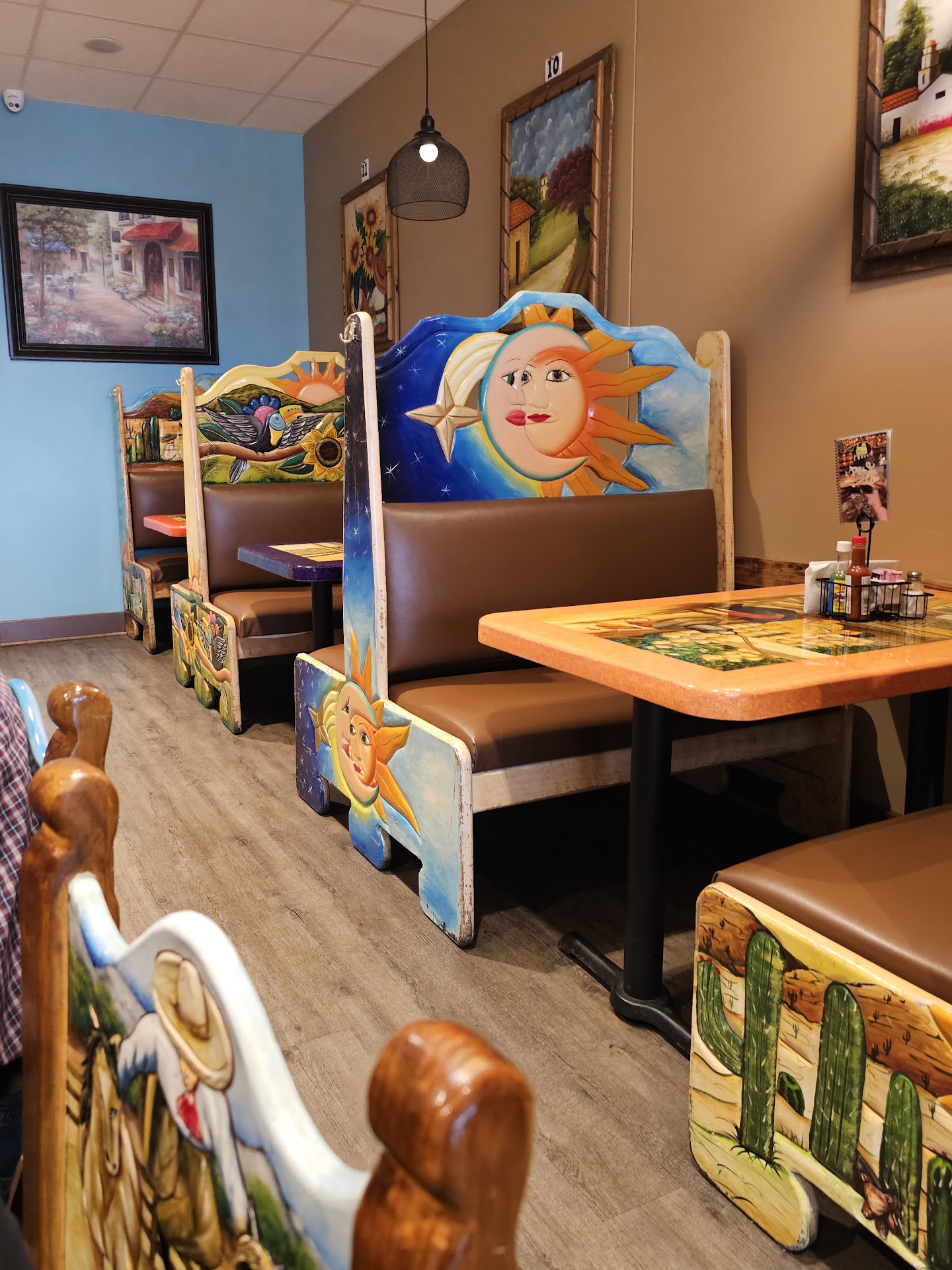 The atmosphere is also quite nice. Don't let it being in a strip mall fool you. As unassuming as it is on the outside, the inside is bright and colorful, and the benches, chairs and tables are all beautiful, unique, hand-painted pieces of art that are really fun to look at while waiting for your food. This is my second time being here, and both times the servers have been very attentive and pleasant, and the food has come out relatively fast.