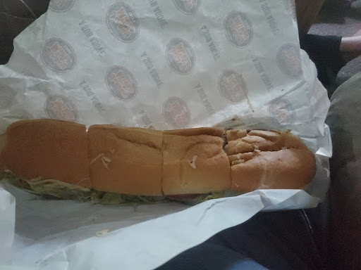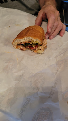 Got the big kahuna and it was mainly a big flop. My sandwich fell apart instantly when I picked it up, the bottom bun almost nonexistent as it was so soggy. I'm holding the bottom bun in the picture below. And WAY too much stuff on that sub, it was not very good. There were way too many jalapeños (compared to meat & other ingredients) I understand it's supposed to be spicy and that's what I wanted but it it was mainly inedible. All I ate was the top bun after it collapsed since there was also barely any cheese on the top bun, just a soggy glop of meat, peppers & mushroom. I wouldn't of been so bad if it was extremely soggy and just impossible to pick up & eat. The contents of the sandwich leaked out of the bag and this overall was a bad experience. The associates working there were okay, kept getting confused and the communication wasn't the best but that wasn't really a problem. I've gotten this sub in the past and it has never been this wet & soggy before. For a $12 sub to fall apart like this within seconds of eating it is a big pass for me. You can't even distinguish where the bread is because it fell apart so much. Sorry Jersey Mike's. But this is...