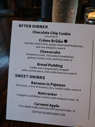 Read moreTonight my husband and I went for a pre-anniversary dinner at Odyssey. It was a lovely dining experience. He ordered his first generous pour of a premium bourbon upon arrival. They usually always have a selection that meets the needs of his snooty whiskey pallet. Soon, after wavering between the bruschetta board and the parmesan truffle chips, we jointly chose the parmesan truffle chips. They are very good. Be careful though. They are served with a sanbal sauce that goes well with the chips. The sanbal has a definite zing to it. I like it, but , if you have a delicate tolerance, you might want to dip in accordingly. After aggressively enjoying the parmesan truffle chips, we ordered our meals. Btw, our server was a nice man named Dale. He was appropriately knowledgeable and presented himself and the menu in the best manner. I ordered the salmon with a double down serving of brussel sprouts. My husband ordered a large fillet with brussel sprouts and mashed potatoes. He also went with the additional mushrooms and caramelized onions on the fillet. We thoroughly appreciated our selections. My husband enjoyed yet another generous pour of premium bourbon. The meats were cooked as we preferred and the sides were fantastic. As we were scraping every last bite off of our plates, a hosting lady brought us the dessert menu. We were plenty full, but dessert is my thing. I ordered a banana after dinner drink to go. The drink was a very nice ending to a great. Anniversary dinner. I resent we didn't send a six pack to the kitchen. Many thanks for a...