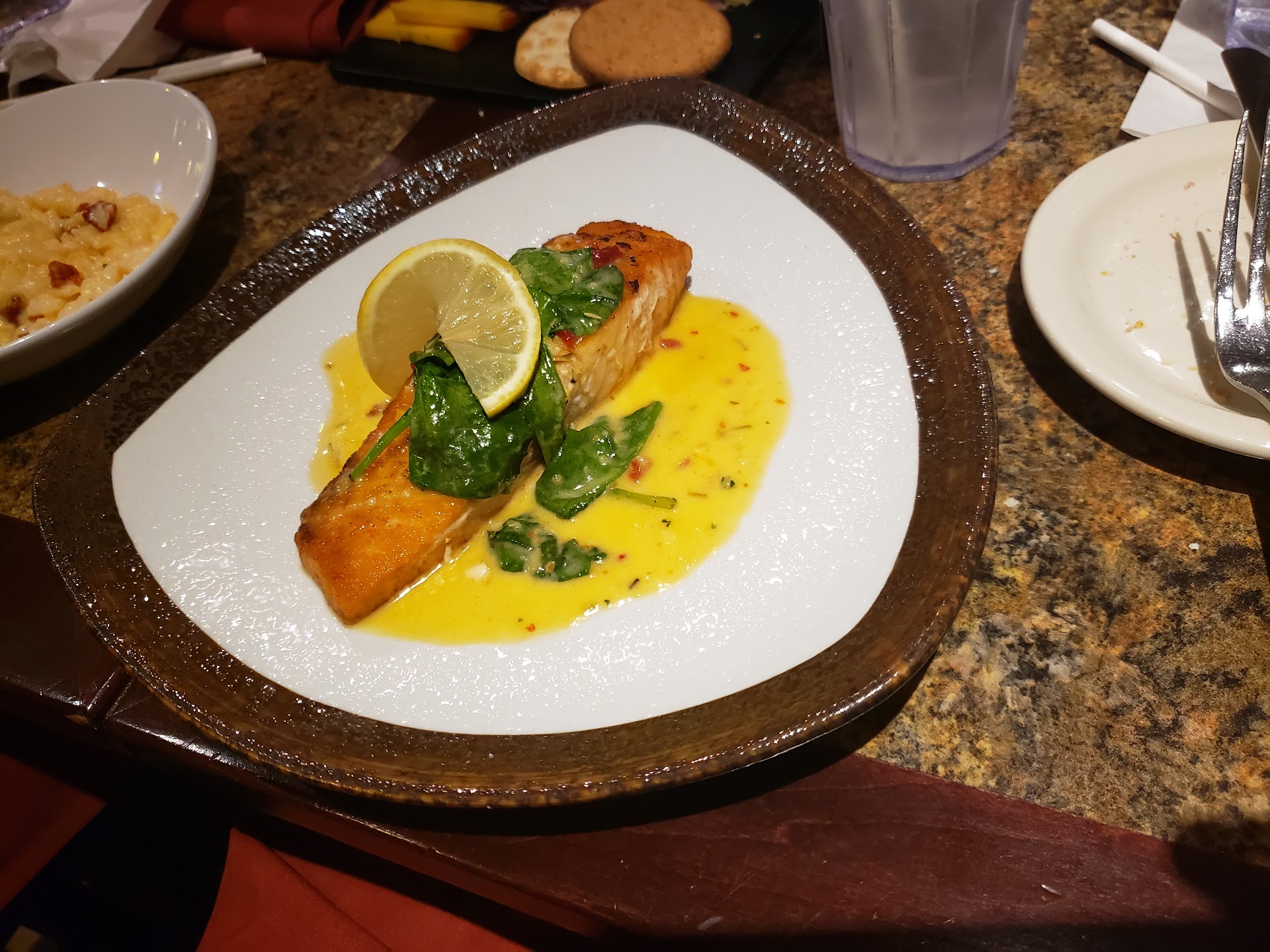 The short rib risotto was another story. Menu description: “Slow braised boneless short ribs, cabernet beef demi sauce, and wild mushroom served on a bed of classic parmesan risotto.” Plating was rather messy with parsley scattered all around the rim of After reading “Slow Braised” I was anticipating fork tender, no-knife needed, melt in your mouth texture. Unfortunately, the texture was closer to rubbery canned beef, and it took a knife to cut the meat that was quite dry in the inside. The risotto was certainly creamy, but lacked much flavor of Parmesan. The Demi glacé tasted commercial and the mushrooms were far from wild.