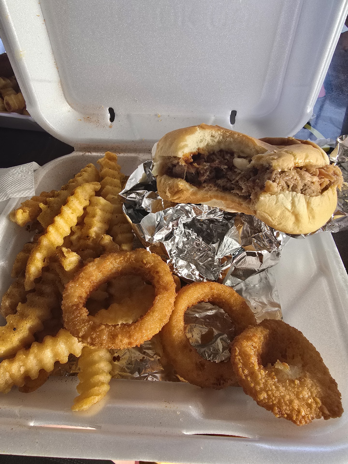 As I live 4 hours away from the nearest location and wanted to know first, if I could purchase the items in bulk Being told no I asked if the packaging would be such that the food could make the trip without becoming a soggy mess - are the carryout containers three-compartment? The answer; "Yes". They are, in fact, not three-compartment but one. After receiving the order of 7 plates, we stood in the dining room and re-packed everything to separate the fries from the coleslaw, the hush puppies from the barbeque with sauce, etc. ourselves. I believe that had the manager stopped long enough to hear what my goal was, he might have come up with a creative solution using the resources available like packing each component in...