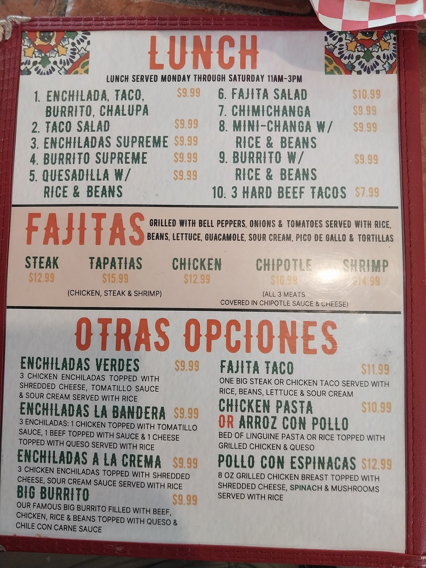 Read moreOh no! But JUST NO! Food was so awful. No flavor at all. I cannot believe anyone could possibly like this place. I had enchiladas poblanos, nachos, taco salad and 1 corn birria. The birria was extremely soggy and just had no flavor at all. The taco salad was extremely underwhelming and just a mixture of salad stuff with cheese poured on top to hold it all together. Nachos? Oh, what to say? They were just ground beef with melted cheese on top. The enchiladas? Zero minus zero flavor. I have had better meals from the frozen foods section. No garnishments at all - no sour cream, no salsa, no lemon/lime , pic degallo, not even 1 slice of jalepeno or a sprig of parsley or cilantro. Zero ZERO ZERO! Nothing to help jazz up this horrid waste of money and hungry pit in my stomach - cannot...