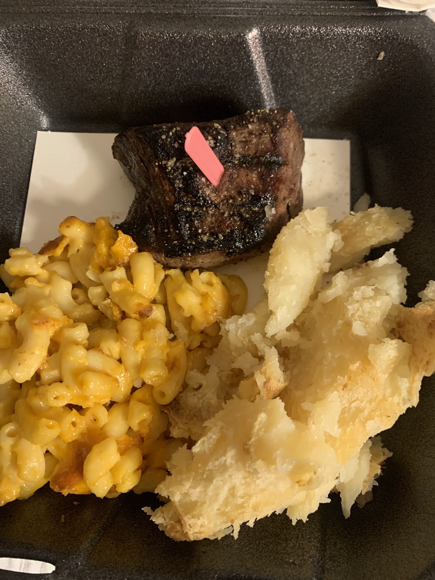 Read moreOrdered online to-go, got there 4 minutes before my food was supposed to be ready. The first person I saw seating people told a couple it would be 2 more tables and then seated a part of 4 first, so they left, she didnât say anything or try to help them much. They couldnât find my online order. Offered to go ahead and place the order and cook it 15 minutes after my food was supposed to be ready, I asked how long it would take, they said 20 minutes. Finally determined that an order came up âwithout a receiptâ and got (most) of my food 20 minutes after my food was supposed to be ready, so it was cold when I got it. Was told they were âbusyâ so they were out of bread but I could wait 4 minutes for more. The experience thus far didnât make for a hopeful outcome. I did not stick around to find out. There were some apples with my food and I confirmed they werenât mine. She took the smaller bag out of my bag. My potato had no cheese, no toppings and if I had to guess were in the smaller bag. Because I didnât double check the full bag before I left I didnât know til I was back at the hotel. The steak was so tough I couldnât cut it, let alone eat it. When traveling, I usually eat chains only because of the consistency if Iâm in a hurry and not feeling adventurous. If I wanted to wait an hour for lukewarm food, I would have taken a chance on a local place.
