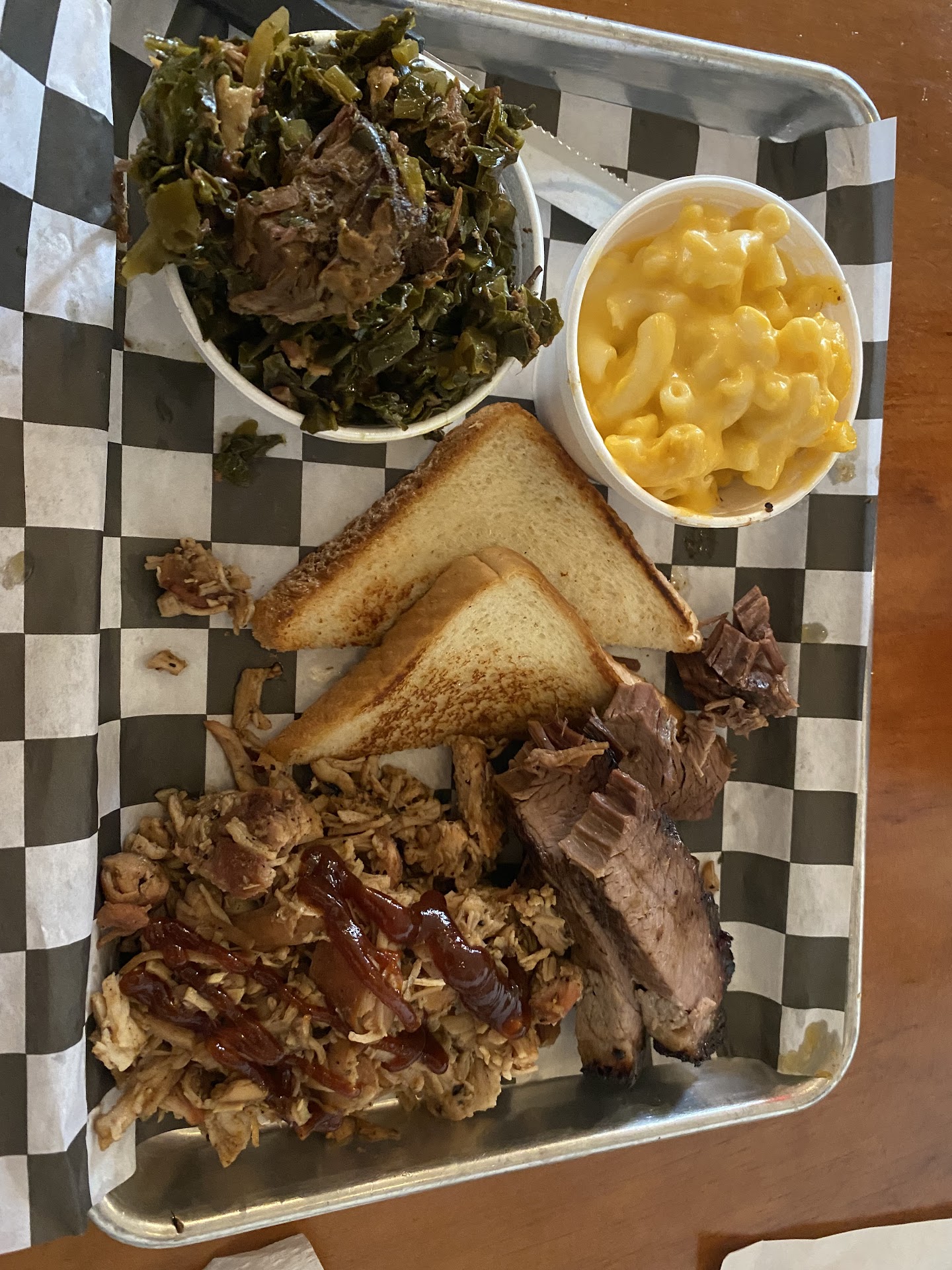 1st of all- service can make or break a dining experience.. even if you have good food, a crappy server can ruin the whole dining experience. REQUEST JOEL! He is so great! Has great recommendations! Can handle multiple tables w/o leaving you waiting or feeling rushed... And heâs fun! 2nd- the food! Between the 5 of us we had some of all of it .. Iâll break down what we thought of each- if you donât want to read all that- just know that it was a 9/10 in deliciousness! And bottom line- we will be back over and over - and requesting Joel every time! đ WINGS- table agreed these were the best wings ever (and they are huge wing fans!) - hubby said next time heâd get something other than âsweet asianâ though ... đ„ BURNT ENDS- couldnât be more delish! Charred, fatty, rich, meaty, crispy, chewy, juicy all at once... yes- I WILL have them again, and again! (But Joel warned me- Get there early! They sell out!! đąđČ) đ„BAKED POTATO SALAD - itâs a lot like other smokehouse tater salads, but better- and a perfect creamy, cold side for the hot, heavy, rich burnt ends! đ SWEET POTATO FRIES- sweet, crispy outside and soft inside... delish! đ„ŁBAKED BEANS- Iâm not a huge fan of them in general, but these were very good and full of bits of meat! Table agreed they were some of the best! đCOLLARDS- mixed reviews at the table- some loved some didnât care for them đHALF CHICKEN- flash fried off the pit - so skin is crisp and juices are locked in- very juicy and good đŽFRIED OKRA- very good! Canât tell if it was prefrozen or not- but itâs not the âgas station fried okraâ or âschool cafeteria versionâ if it is prefrozen đRIBS- fall off the bone tender, smoky, juicy goodness - forget picking it up w/ bone- bone comes out clean - such a good flavor- not overly smoky (which I hate) .. even the one in my Bloody Mary was yummy! Yes- I said IN my Bloody Mary! Cold and soaked in drink- but so good! đ„BRISKET - tender! So tasty and good!! It is not overly juicy but not really dry either .. again, nice smoke ring and flavor, but not overly smoky đ SMOKED TUNA DIP - I donât like fish, so I didnât try. It was a nice size scoop of smoked yellow fin tuna salad on a piece of lettuce served w/ packs of crackers - the other 4 scarfed it down saying how good it was - hubby says heâll be ordering it as appetizer next time we go đč Bloody Mary.... holy smokes! I was too full to eat my meal after I got done w/ it.. topped with olives stuffed w/ pulled pork.. pickled green bean, full slice of brisket, and a WHOLE RIB ... and the drink is made right- really right! Great flavors!