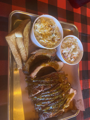 I ordered my food to go so take my review for what it is worth. When I walked in to pick up my food, at the time I was told to show up, my food was being walked up to the front desk. Great timing and friendly girl up front. It was my first time inside the building and it looked very nice just maybe a bit dark but it was clear some care was put into the building. I was somewhat disappointed that I could not see where they were doing their cooking from and I believe I have an idea of why. Now itâs time for what matters, the food. I ordered brisket, pork ribs, burnt ends, fries and Mc n cheese. My wife ordered burnt ends and sausage with potato salad and Mac n cheese. The burnt ends were the highlight of the meal. Well seasoned and very tender. The sausage was also very tasty. A little sweet on the front and good mix of seasonings. Very tasty. That is where the good ended. The Mac n cheese was bland and tasted like nothing but black pepper. The potato salad was seasoned but nothing special. The fries were nothing to write home about either lacking nearly any semblance of salt. I was disappointed the second I opened my food because I saw zero smoke ring on the ribs or the brisket. The ribs were not tough, but not tender either and the flavor was ok. They seemed grossly overcooked. The brisket had zero bark and was dry dry dry. The brisket only came from the flat(lean). Iâd have liked an option for fatty brisket from the point but that was not an option and they did not bother to include any in my order. Genuinely, it tasted like it was made in an electric smoker by a dad who got a new Weber for his birthday. I did not finish either the ribs or the brisket and I served most of the brisket to my dogs. For the price this is incredibly disappointing. For a 3 meat platter and a 2 meat platter and a tip it was $51. As somebody who travels to places just to try BBQ, I was eager to have a good place in my backyard. Having moved here from Texas, I was hopeful this place would be good. However my experience ultimately left me largely...