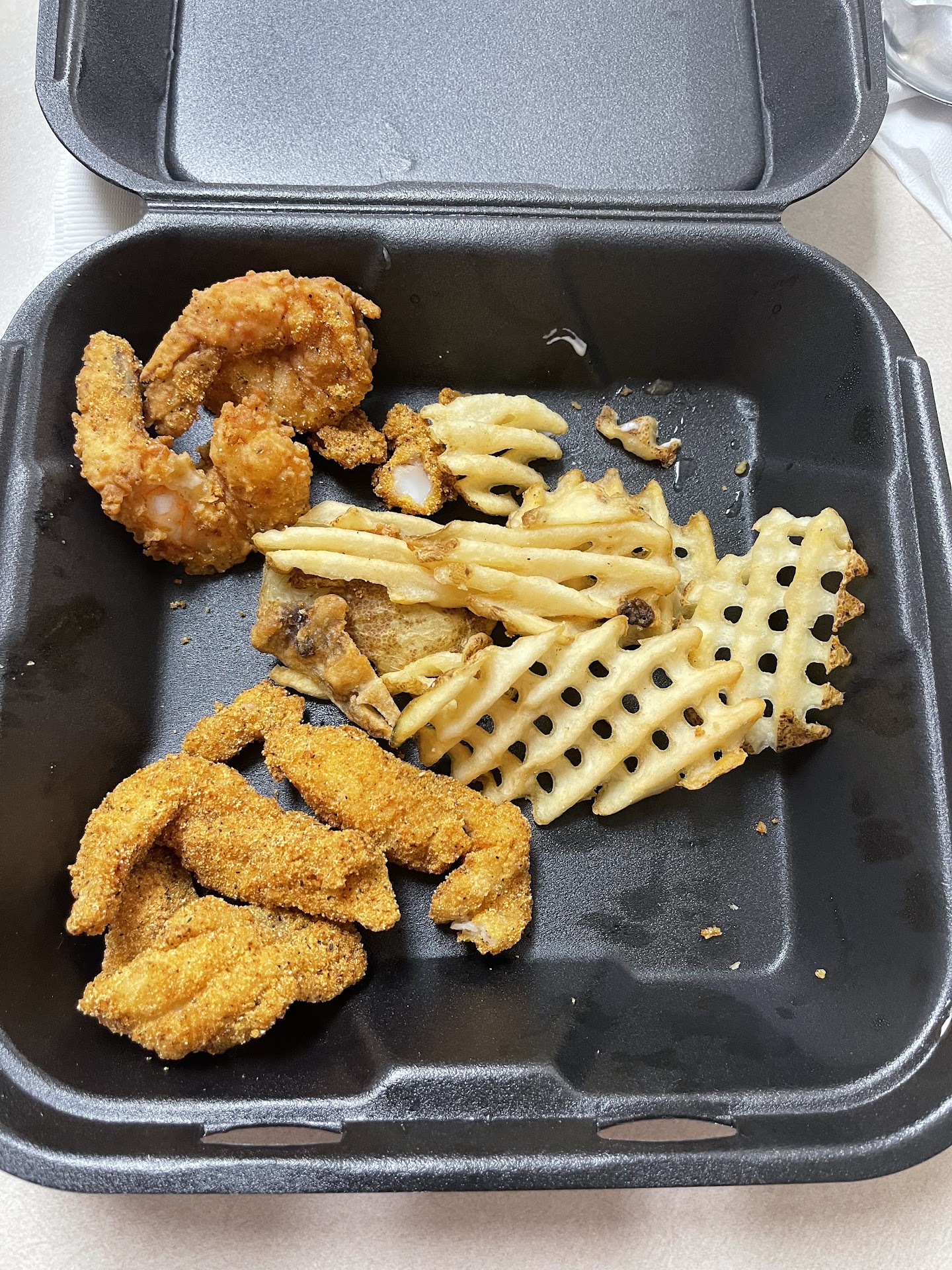 Everything started out good, but the server was the beginning of the End. She rarely checked on us, wasn't visible a most of the time, with two fairly empty glasses of the table- why bring one refill- didn't ask if I nor my son wanted refills- just dropped off the one glass and walked off. She didn't bother to ask about desserts, just sad customer service. Now the food, LA combo pretty good flavors, most places are scared to season their catfish, but them. However to only give four shrimp(a little pale too)to the catfish curls ratio is laughable. I will never understand why over cooking salmon is so common in Hattiesburg. A dry salmon with a watered down Cola.The presentation of the salmon was very Underwhelming. The plate was entirely too large for the amount of food on the plate; there was a huge space on the plate as if it was begging for another side.With that said my son's cheese quesadilla was pretty good
