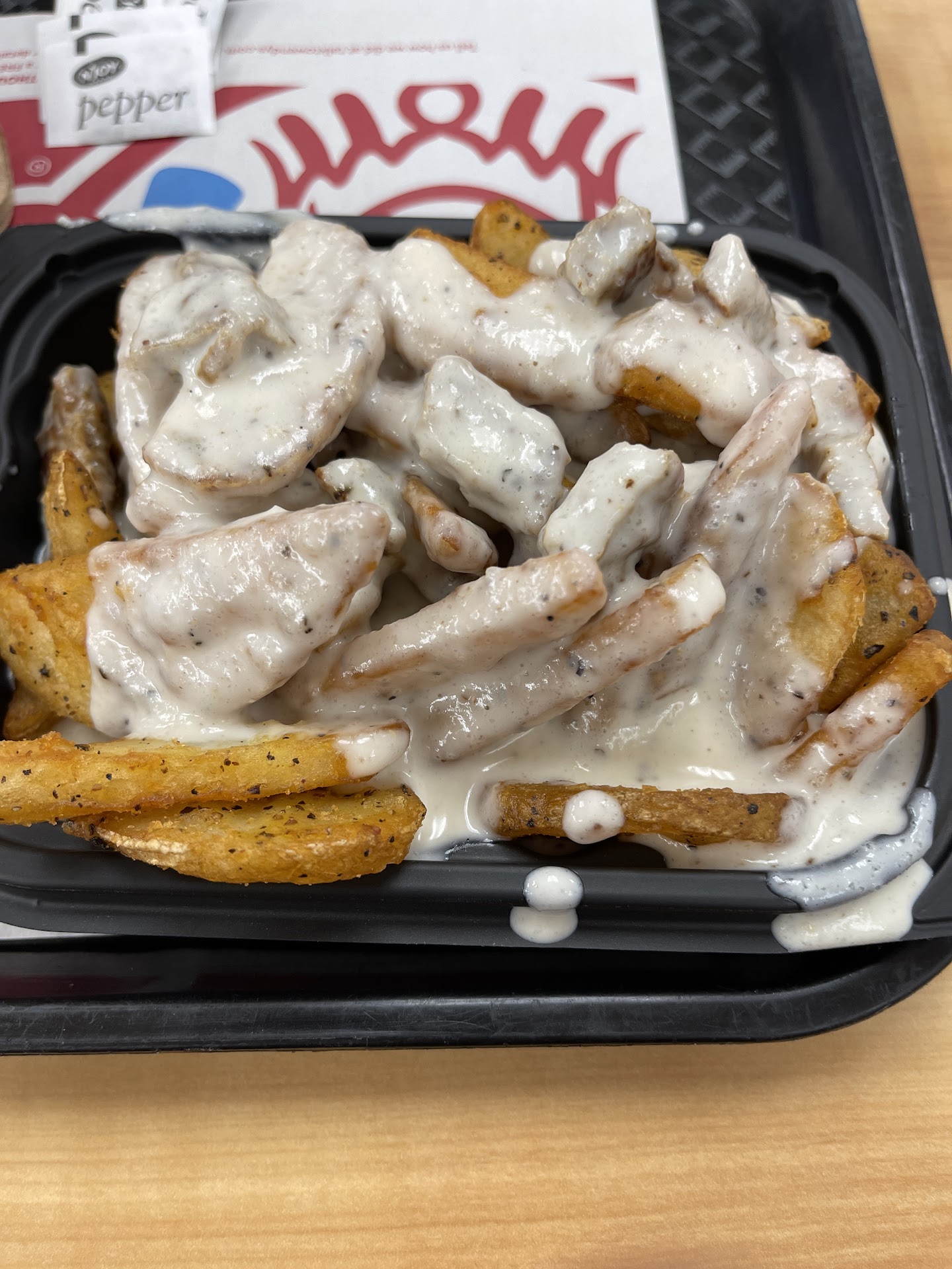 The floor was slick upon entering the door as if I had just entered the kitchen area of the restaurant. The actual kitchen area (visible from the front counter) had a visible layer of grease glossed over the floor mixed with salt and fry debris; the staff obviously had issues walking through this high traffic area. The dining room area was a whole new beast, where the floor suddenly became mercilessly sticky like you would expect from a movie theater. In fact the whole dining room felt sticky from the tables to the chairs as well, with several tables littered with trash and crumbs. However it was around 12:45pm on a Thursday, they were very busy and they were working on cleaning the kitchen shortly after my arrival. Most importantly however is that the staff was very helpful and pleasant to deal with, and their food was fast, fresh, and delicious. That (on top of the fact that the bathrooms were actually really clean) was what made me give 3 stars...