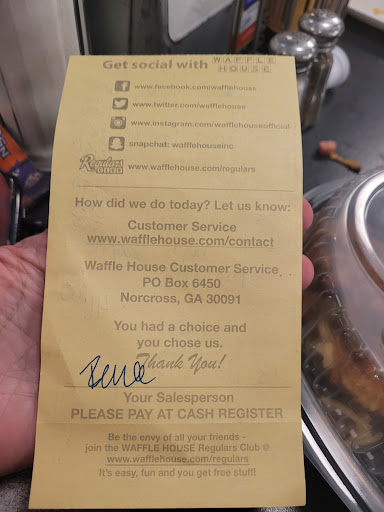 Read moreWalked in with a table being cleaned off. Water was left on the table and it was a lot. I asked the servers for a dry rag. She said they didnt have one. I took a handful of napkins and dried it myself. I ordered the All Star and my son got just a waffle. They were brought out with no syrup. I asked as she walked away and assumed she heard me. Waited a minute and saw her washing dishes. Waved her down and she brought some over with my bacon. Now this bacon was a joke. I dont think anyone there would have eaten it. Burnt black on one end and raw on the other. I told her I didnt want it and she offered to have it remade. I declined because that was a joke. After eaten we went to the register and stood there while the girl working it was talking at the grill. She looked at us twice and still continued talking. She then asked if we were ready to check out. Yeah that is why I am standing here with a yellow ticket. What is wrong with people today....