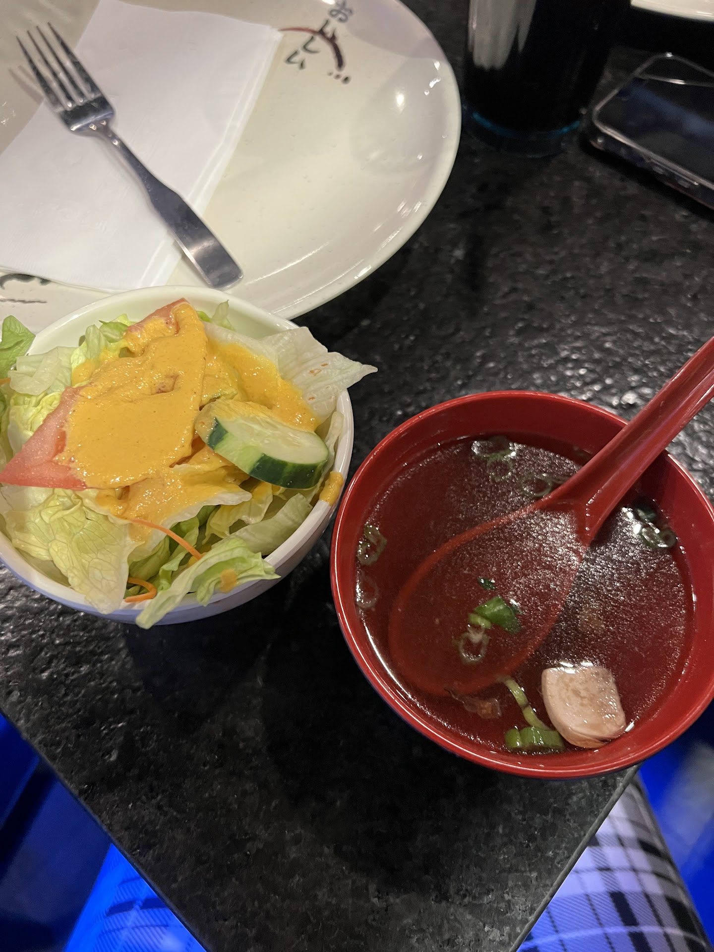 Read moreI was looking for a great Hibachi place and booked reservations with high hopes based off of the more recent google reviews. We arrived a little earlier then the 3:30 reservation but were still able to be seated rather quickly but then turned rather uncomfortable once realizing the front end manager who had began taking down our drink orders began yelling out to an employee who had just finished serving his table across from us and was about to walk out on his break. She told him to switch that around to begin serving us and wait until someone else came in at 4pm to take his break. You could see the shock on his face and a bit of embarrassment. He stated he was already heading out on break and that wouldn’t work for him. She continued to pressure him in front of my party and when we began chatting amongst each other that we’d wait it was no big deal but the employee, very admirably asked that the manager please come speak to him about this in private not in front of the customers. I thought that was both amazingly professional of him and sad that he had to remind his supervisor of that. Moving on, the manager was still unable to get the drink order correct , hear nor there , the server corrected her mistake. The soup and salad were mediocre. Salad was sitting prepared for too long so the tomatoes were soggy and nasty and the lettuce tasted like a refrigerator that hadn’t been cleaned in a while. The dressing was chunky and sparse. The soup was room temperature and but oily for my liking.