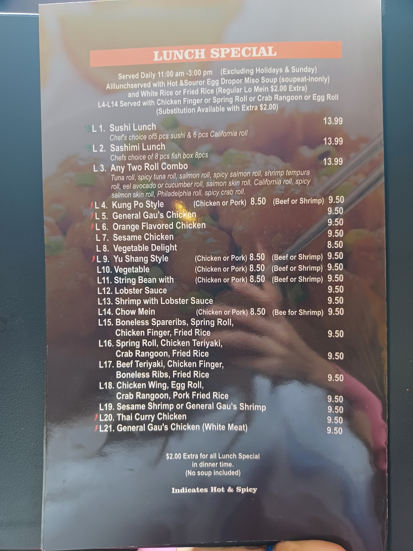 I would highly recommend the sizzling platters. I tried the shrimp and scallops one, that was tasty, hot and sizzling, well cooked, has sauce, and the scallops just melt in your mouth. The prices are on point here. I spent about $50 on my own stuff because I wanted to try a bunch of items (sizzling platter, house fried rice, crab rangoon, scallion pancake, and a drink).The lunch specials are where the real savings are, in my opinion, so I'm definitely returning for lunch here asap!