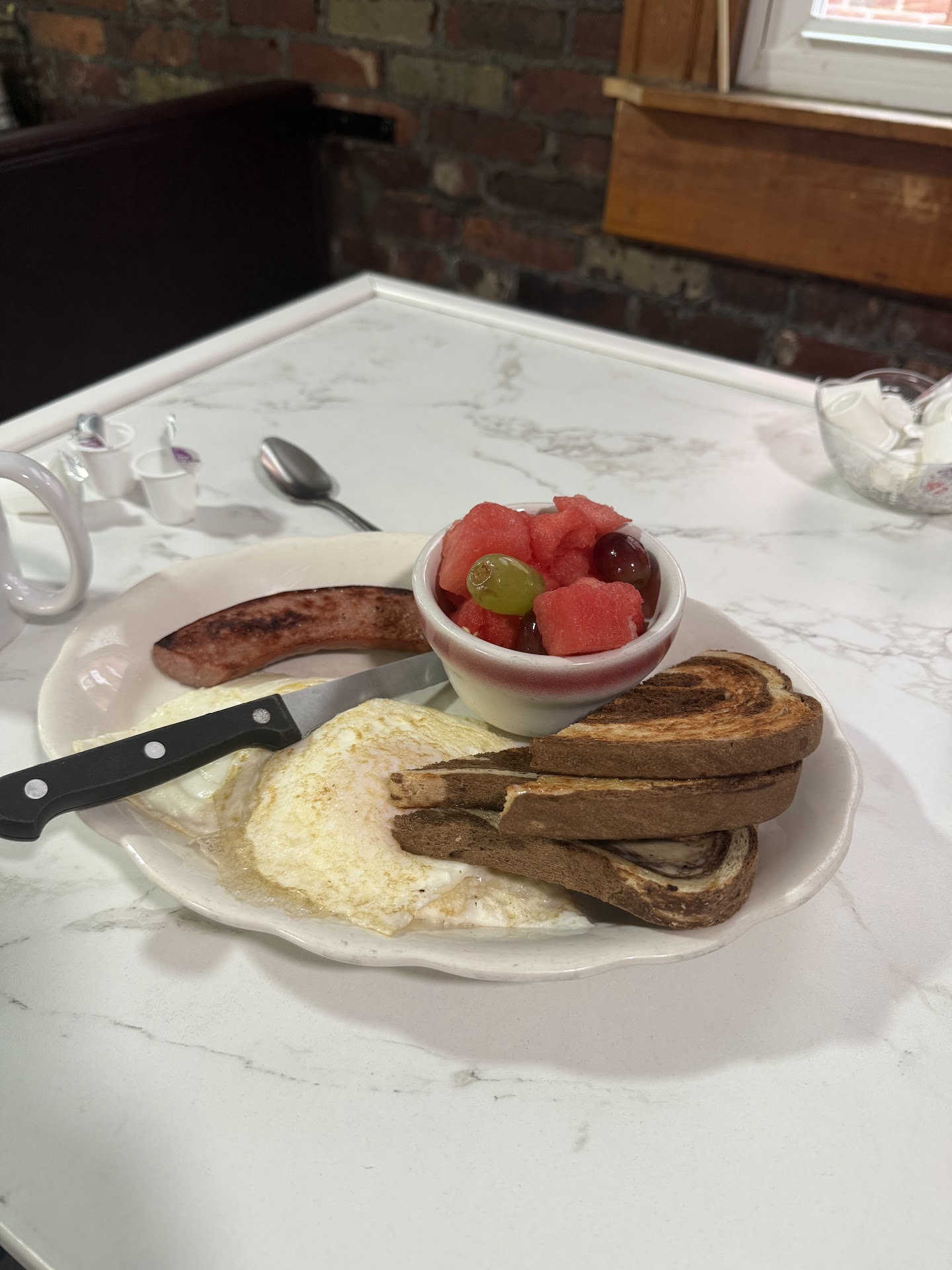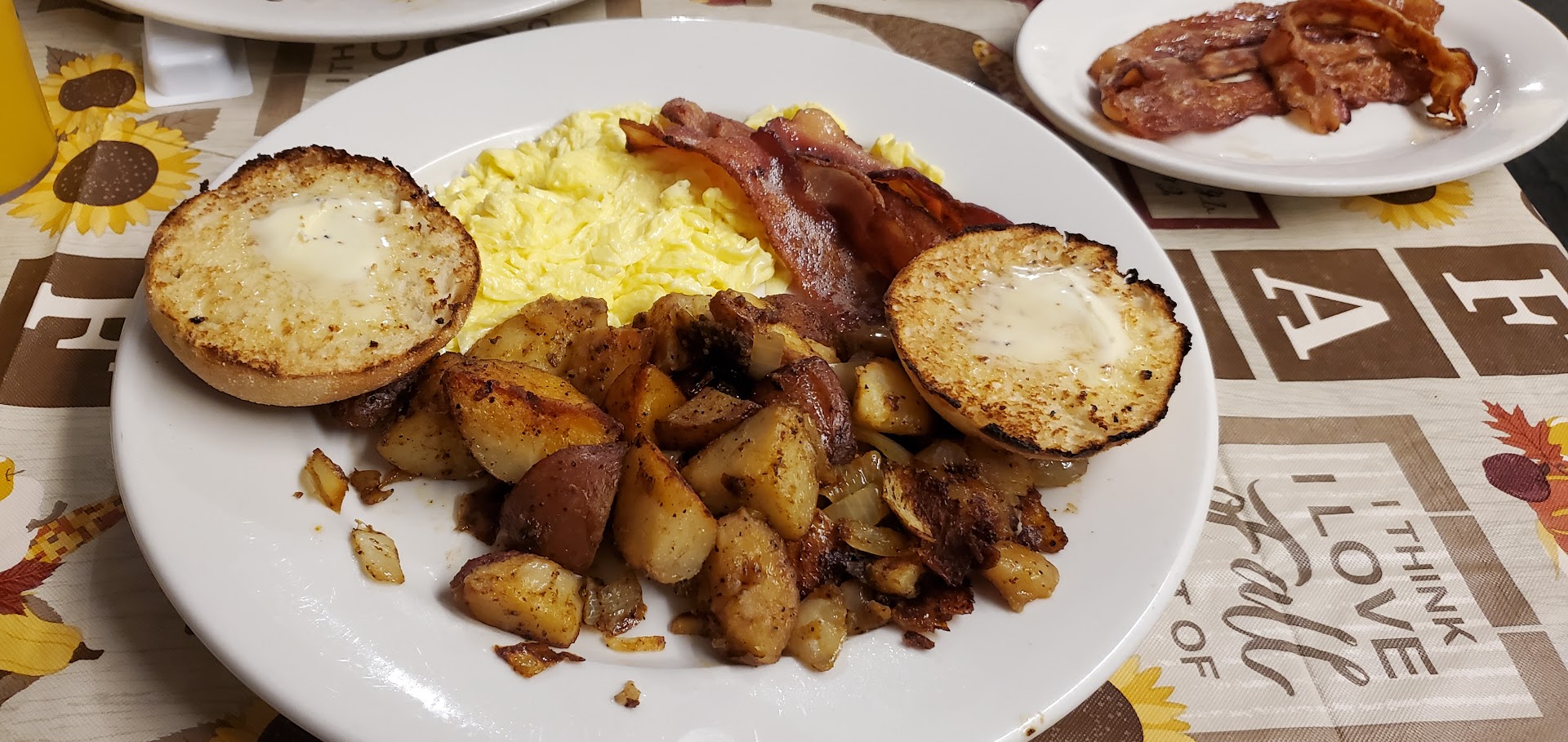 I was excited to visit under the new owner. We sat at one of the small tables near the wall. If you are just having coffee or you are alone, it's not bad. There was no room for our food. We had to condense them onto one plate. Servers are friendly and attentive, I almost forgot to take pictures because the food took so long to come out about 25 minutes. They don't have a full breakfast like other restaurants. My husband was disappointed, 1,2 or 3 eggs with toast and home fries, meat is separate at 4.00 each order. So we both got the hungry villager 3 eggs, but we only got 2, (They did offer to give us the two overeasy eggs to take home when we asked about the menu and eggs) we ordered this so my husband could have the meats he wanted, double toast and eggs, I had the homefries and pancakes . We were told to watch the bill for inconsistency by other customers sitting near us, but our bill was fine. The tea water was boiled, and tea was good 👍🏻 homefries had a taste of onion, I found them to be tasty, the food was good, the pancakes were filling, would suggest a steak knife to cut through, a butter knife takes a bit to cut through the pancakes, blueberries were extra 2.99 so I passed. Coffee is so so. This breakfast nook was my older brothers 1st job as a cook many years ago. The previous long-term owners had a picture with him in it, and it hung up for years, so this place holds memories for me, and I hope and wish them the...