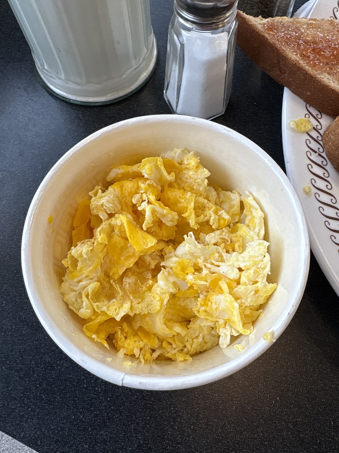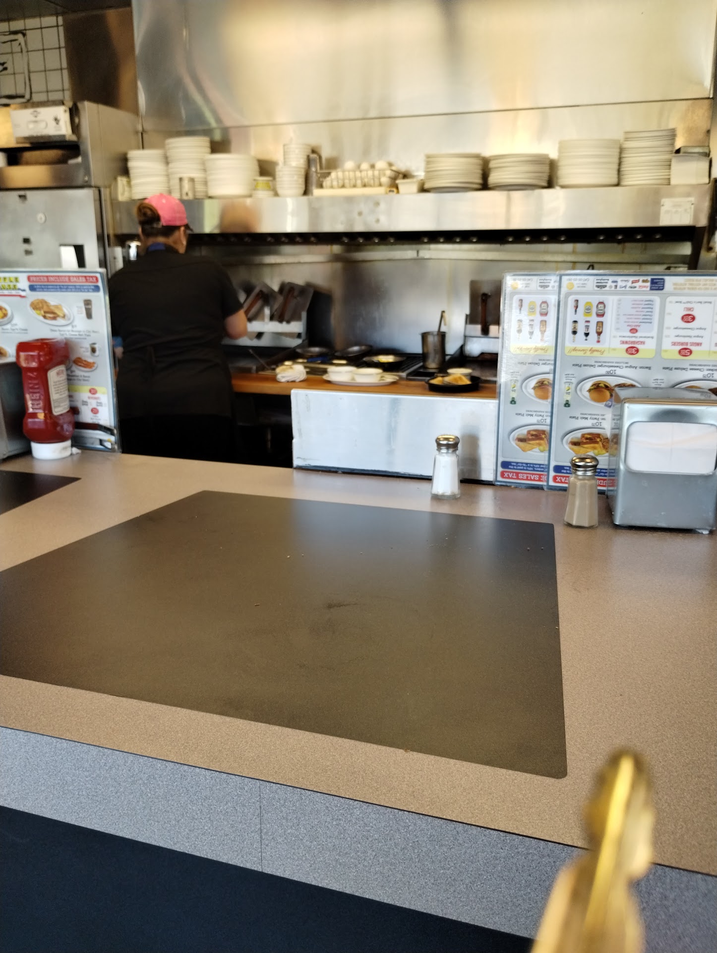 In walks an older gentleman. He sits at the high counter to the far left and everyone working said his name really loud and the server immediately brought him coffee and they were chatting with him.