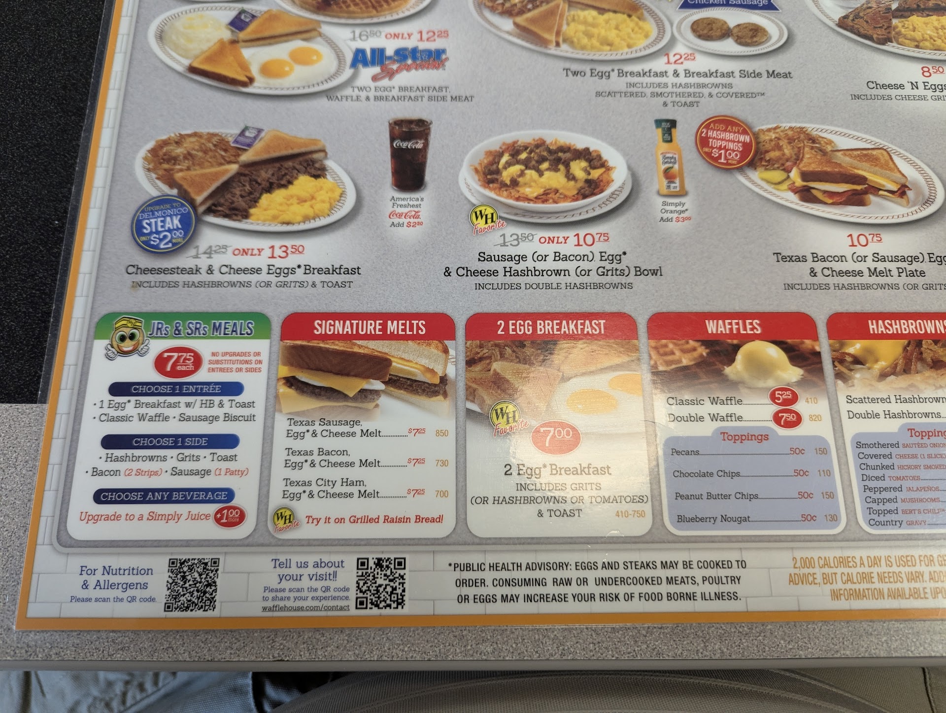 Read moreI thought picking up breakfast was a great idea; boy was I wrong. I was met with bad service and hairy food. The server rushed our order and thought that he needed to take everyone's order a total of seven additional before my food even got called in. Then when I ask for basic things such as sugar-free syrup and butter for my grits, well it eventually came since the priority was to take care of the other seven orders that all came behind me. Another thing was a group of Spanish customers came in and because the waiter did not understand what they were saying regarding moving their seat he mocked them. That was so offensive! He said and I quote (oh you're one of those). When I got home my husband noticed a 3-in long hair in his eggs. The one thing about all of the staff was nobody wore a hair net. The cook had a beard that almost went down to his stomach.It's absolutely gross. Waffle House is not the place to go right now as at least the manager on duty and those not wearing a hair net just don't care about good service. It was horrible. Because of this..... Food was wasted and so was my money. Waffle House I...