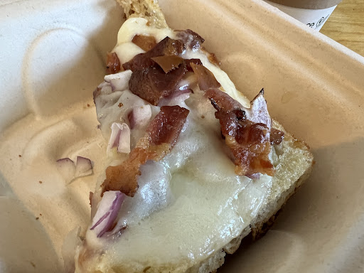 The not-so-goods: There were 3 gals working and they seemed good natured but 2 were quite spaced out. The gal making the drinks seemed to be the most experienced. When my focaccia was ready they called my name and left it on the counter while looking at me. There was no one in line or waiting, the gal just stood there. I was seated at the other side of the cafe with my infant son in my lap. My partner had gone out to the car so I was solo at the moment. It wouldnāt have taken much to bring me the to-go container. Once I opened the box, I saw that the red onions were raw and the bacon was sparse. $9 for cheesy toast essentially.