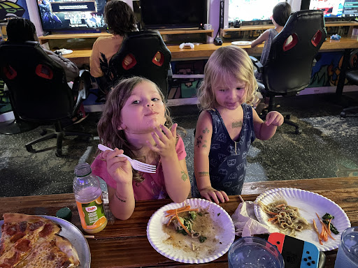 ENTERTAINMENT: As stated, video games on either side. Old school and current games to choose from. At the eating/sitting tables they have old school consoles like NES, Super NES, PlayStation 1, and Sega... I THINK Atari also. At a separate long table (one on both sides) they have Xbox One, PS 4 and Switch. On either side, if video games are not your thing they have cards, and some board games for you to choose from.