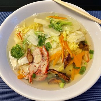 Special Saimin Any saimin lover will enjoy this hearty bowl of wavy eggy noodles, savory broth, veggies, char siu and slices of their tasty BBQ chicken. Highly recommended.