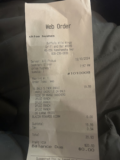 Read moreWould not recommend. We were the only table sat and planned to eat dinner as a family. Appetizer came out incorrectly. Then the boneless wings were mostly fried batter without chicken in them. We ordered 3 entrees. I ordered first and by the time she got to my son, I asked if I could switch from wedges to fries and she said it was too late. She already placed the order on her iPad. Ok so you cant walk to the kitchen and switch it? Ok. Anyway the chix salad was the first to come out and of course my dad tried to wait till all of us had food to eat before he started. The burger came out next. We asked the server how much longer for the chix sandwich since it had already been 15 min from when the salad was dropped. She said food comes out as it’s ready. I explained we came to eat as a family so that would have been nice to know ahead of time. I told my family to just eat. Another 10 min later and after my son finished his burger, my chicken sandwich finally arrived. It and the burned wedges were cold.that was it. The server never once checked on us, never apologized even after expressing disappoint with the food coming out at different times and honestly just didn’t didn’t seem to care. Asked to speak to a manager and finally someone who was helpful. Both my father and I are in the hospitality industry and this was incredibly painful. I have never not tipped. Most of the time it’s not the servers fault. But this was a situation I just could t leave a tip. Asked for the bill while my card was in hand. Server dropped it and walked away. I then had to go to the host to ask her to settle asap. We just wanted leave. Double checked the bill and noticed they gave us a military discount. I don’t know if that was a way to apologize or stereotype but we are...