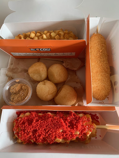 Read more10/10 I highly recommend a quick crunchy, savory and sweet bite at Mr Cows! What a treat after a long shopping day or even a mid day pick me up. The corndog I got with its sweet potato crust, and half mozz half hot dog center was everything I wanted just now. So crispy-crunchy, mildly sweet, oozey cheese, and juicy dog! Not gonna lie I expected it to be smaller but for what you pay I definitely feel the taste and quality meets those expectations. Man I cant wait to be back and try more of their awesom corn dogs...thanks Mr Cow! 😋