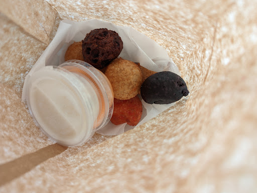 We tried all of the flavors of mochi, and our favorite was the poi. My partner liked the ube second best, and I liked the chocolate second best. We got the white chocolate haupia sauce and the POG sauce. Both had good flavor, but the white chocolate haupia was our favorite dipping sauce.