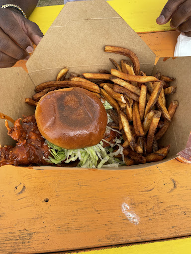 Read moreOnly open on weekends from 12-sold out. As the name suggests, he only has 80 for the day, and when I went last time he was down to 45 left after about 45 minutes, so I doubt he stays there until 4. Don’t let the fries fool you, most of the box is the chicken fillet which is comically bigger than the bun. They serve one thing only, but come hungry and that $17 is worth it. Shareable if you aren’t too hungry. The meal consists of a drink, a sandwich (choice between unsauced and the choice to dunk it in a buffalo-type sauce), and fries with ketchup and blue cheese or ranch dip. 3-5/10 on a heat scale. More a medium than a hot buffalo, so you can definitely still taste the flavors and don’t have to worry about it being too hot. Although the wait is in the hot sun, since he only makes one thing, he is quick and efficient. Ensuring everything is hot and fresh, you can even see him dunk the chicken (magical). Definitely recommend, one of the best sandwiches I’ve had, and I am a chicken sandwich fiend. Owner is also very nice and I felt great...