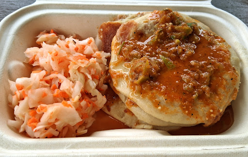 I found this food truck, and the people operating it, absolutely charming. It was my first time eating El Salvadorean food, and I was very excited to try pupusas. They were out of the spinach and cheese flavor, so I got the (3) bean and cheese pupusa meal. It takes about 15 minutes because they make them fresh to order. They were like eating a small stack of pancakes with a bean and cheese filling and came with a delicious vinaigrette coleslaw and a small cup of really spicy hot sauce. I loved the slaw, but the pupusas were rather bland. I realized that I should have paid extra for some sour cream, it definitely would have made them taste better. They have two rows of picnic tables under a tent that makes a comfortable place to eat. I really enjoyed my visit and will be back to try the spinach and...