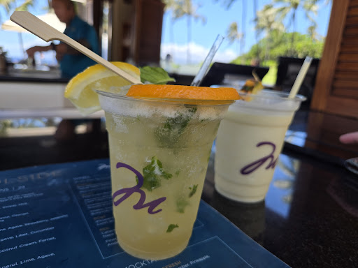 We were swimming, and relaxing down the sidewalk trail at Kapalua Bay Beach. It was a very pretty 3 minute walk up to this bar. We had all of our beach gear (chairs, towels, cooler, bags) and they got us ice water as soon as we sat at the bar. Followed by great hospitality, and the menus.